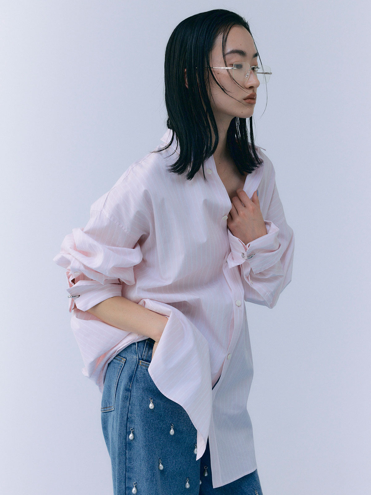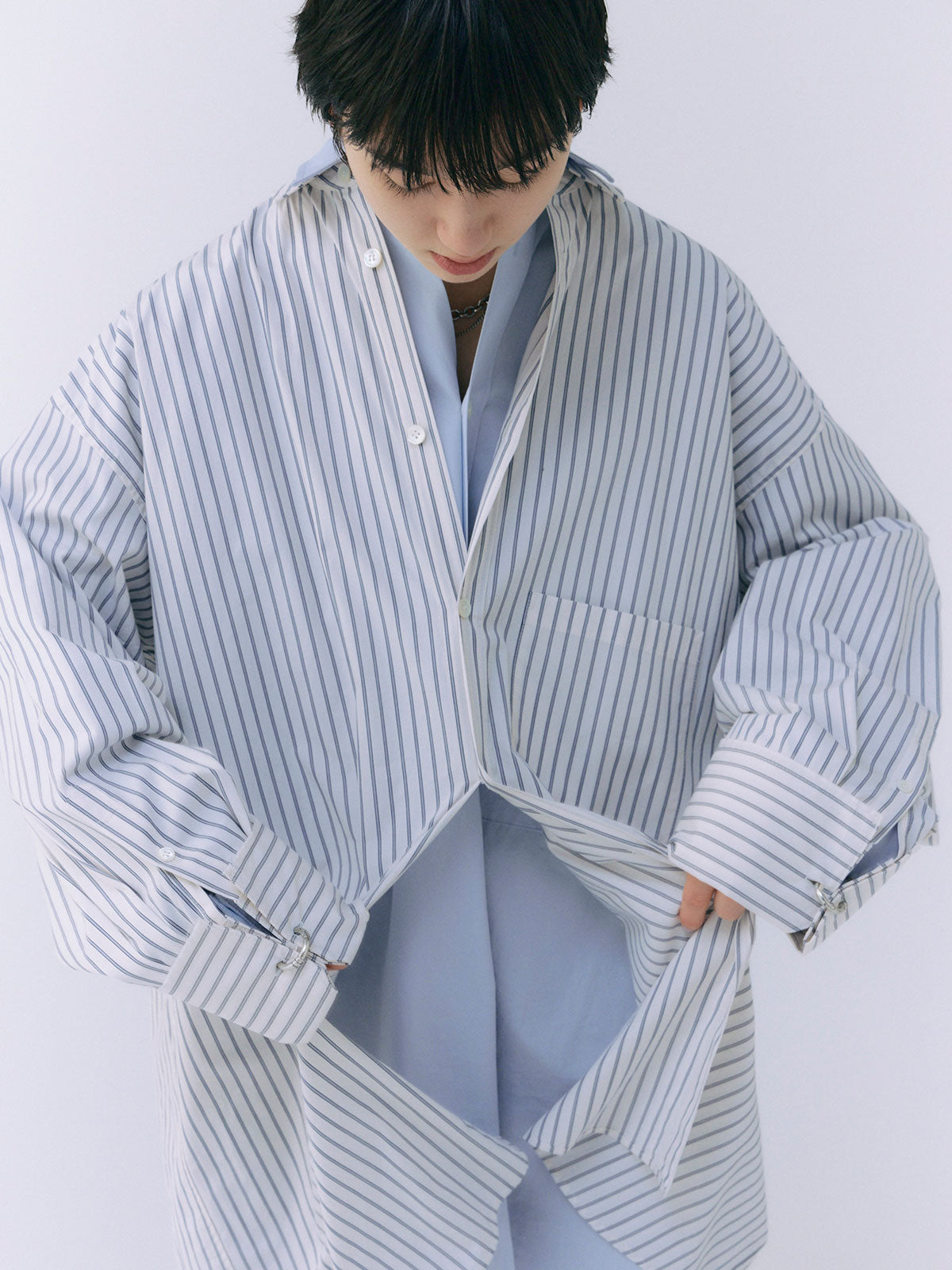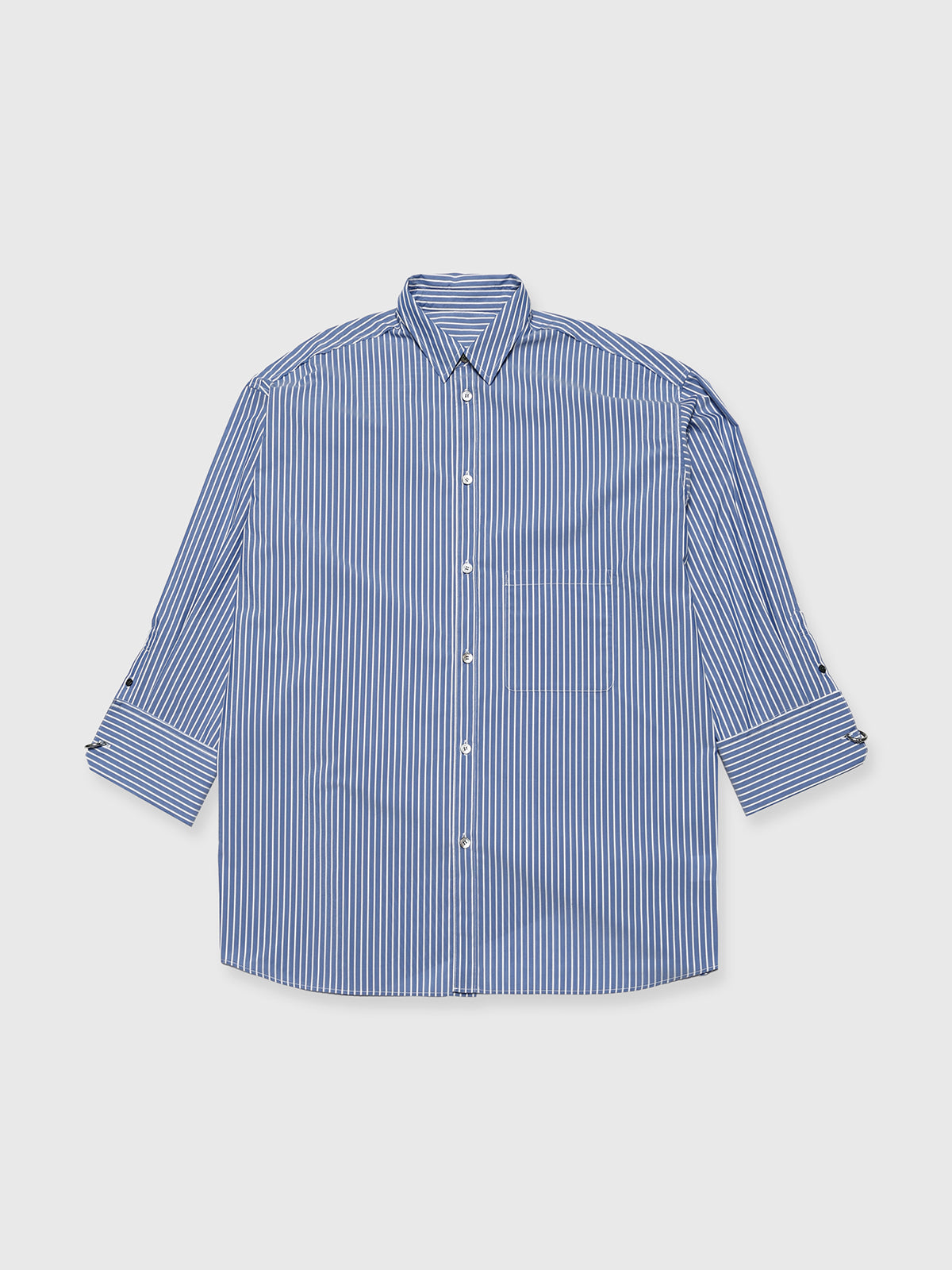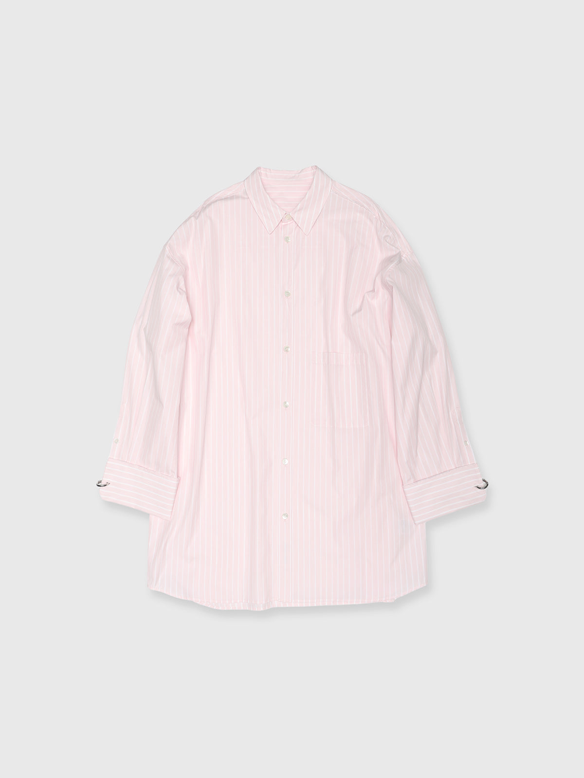 袖口にはオリジナルのリングをあしらったビッグカフスが目を引き、裁ち切り始末などのディテールがシャツ全体を格上げします。