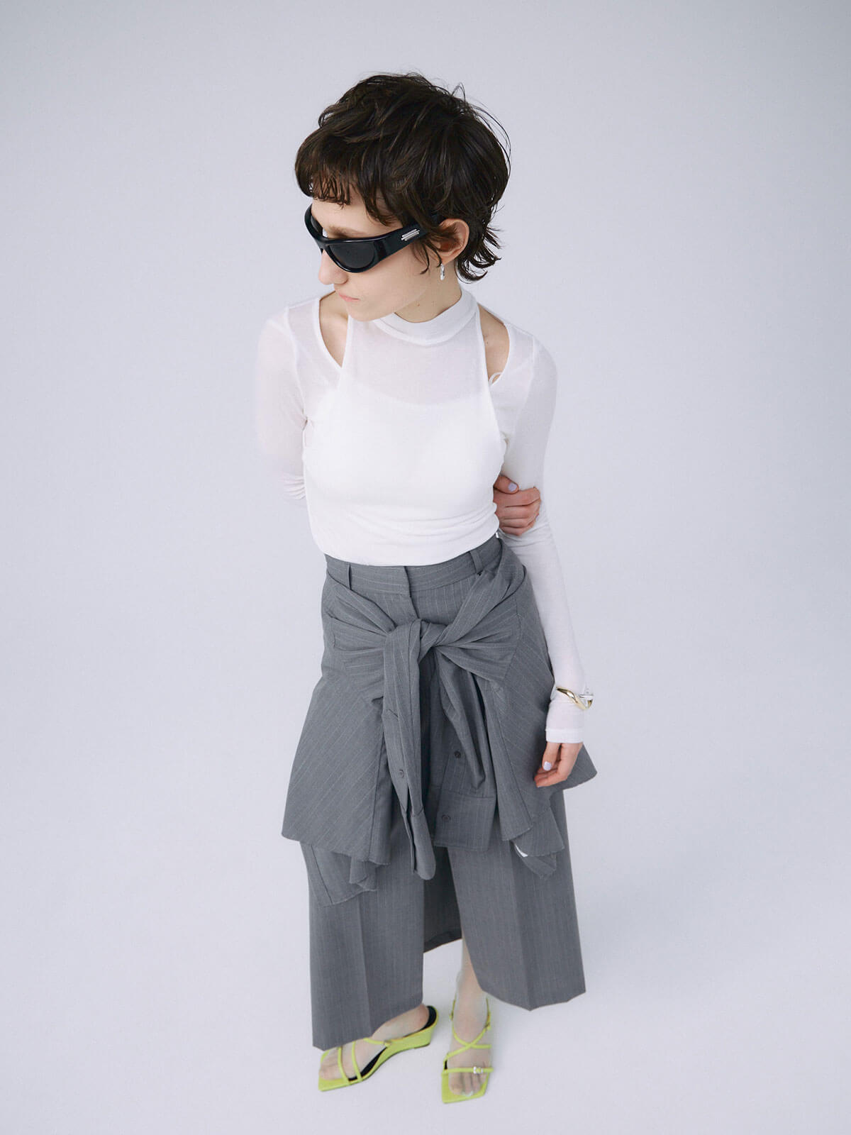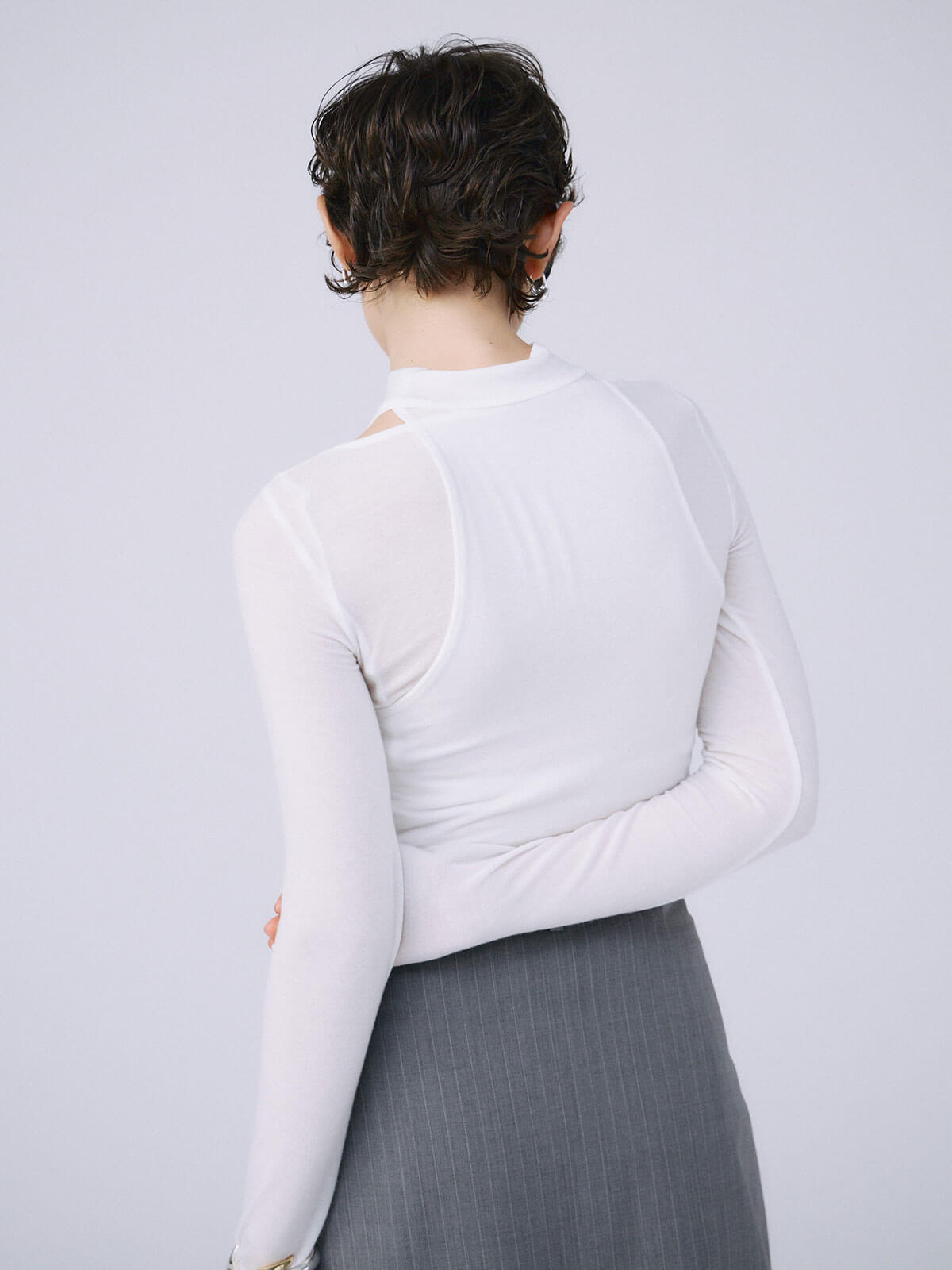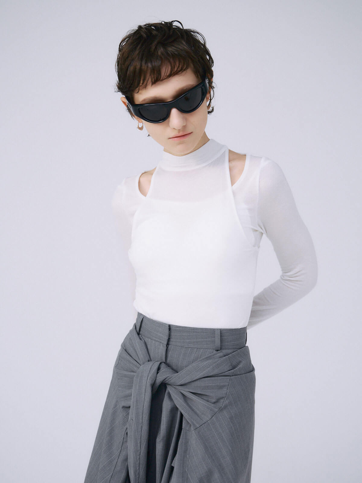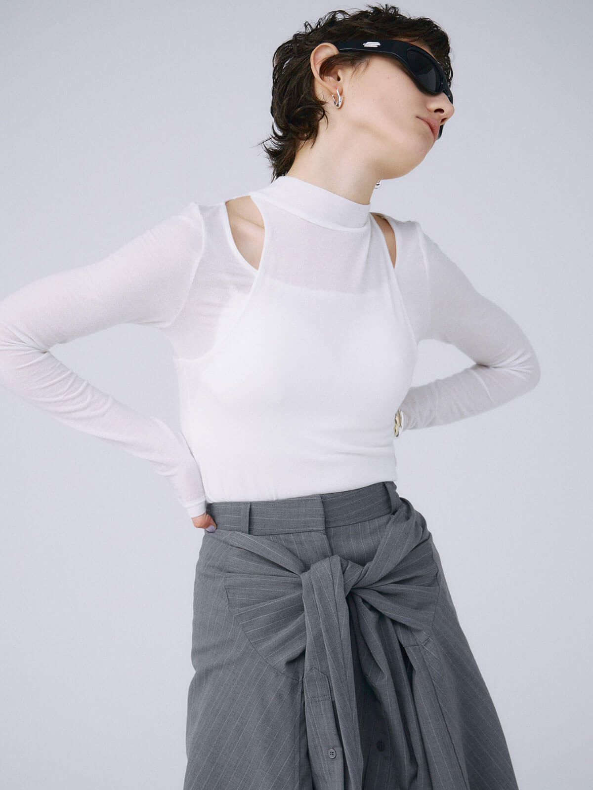 レイヤードしたデザイン、袖部分は程よく透け感がありますが、見頃は2枚仕立てで透けづらく、お下着を気にせず着用いただけます。