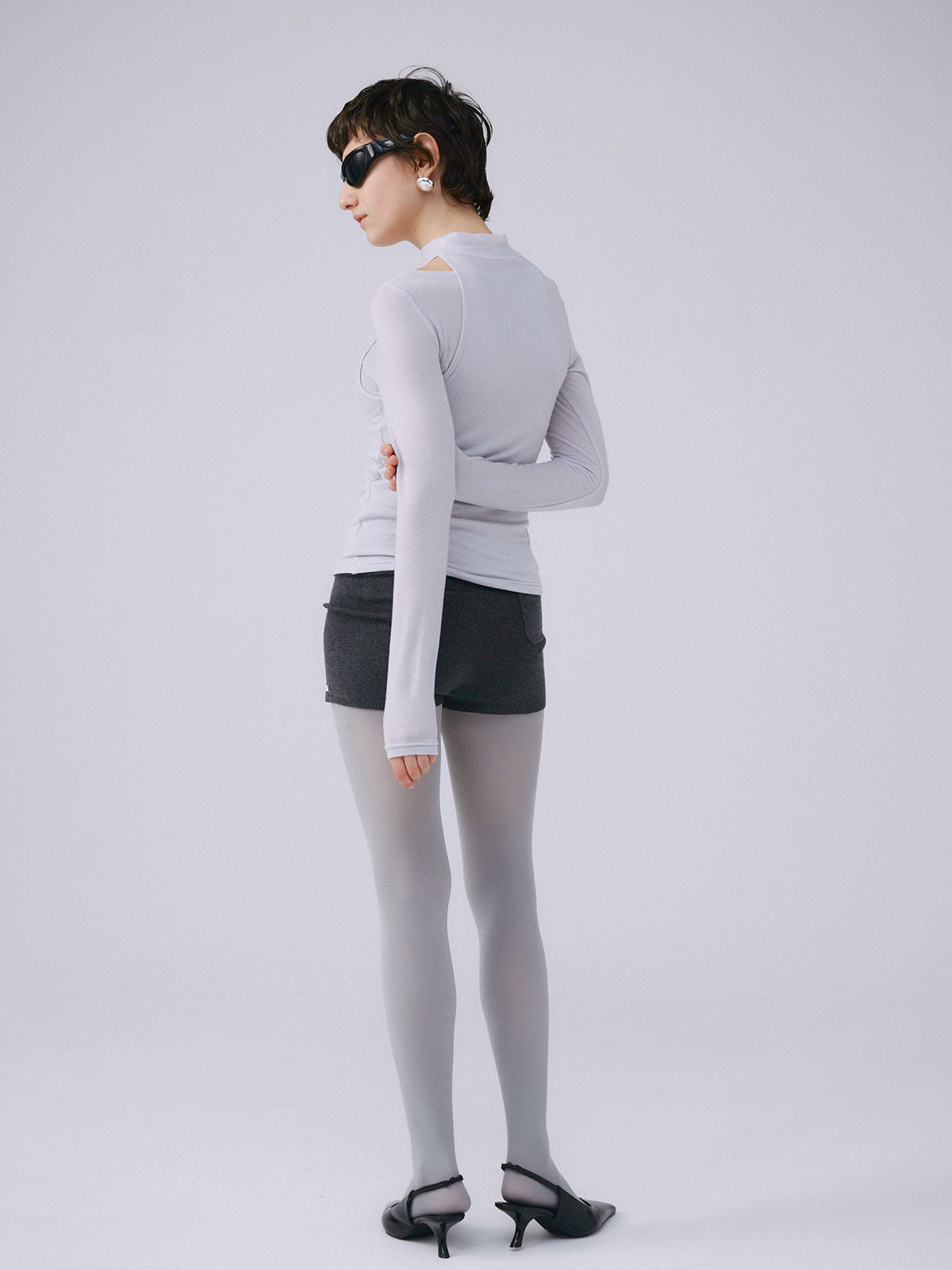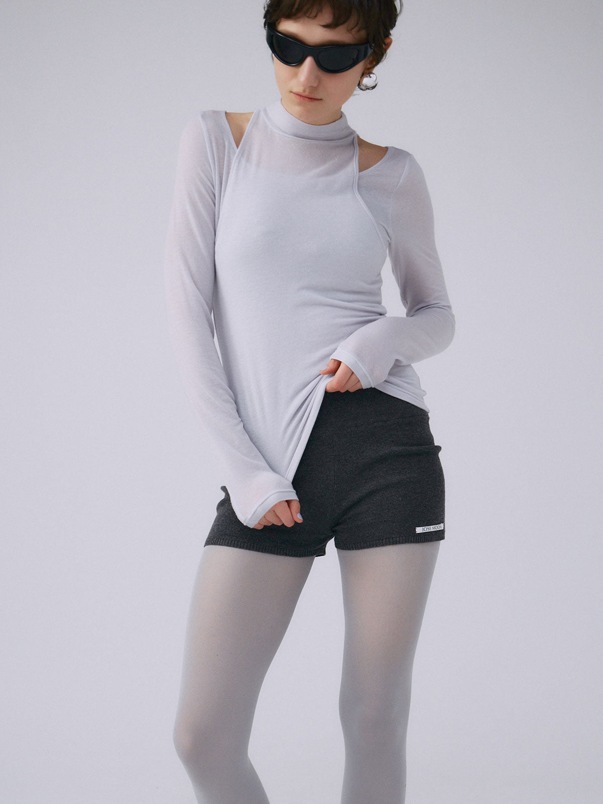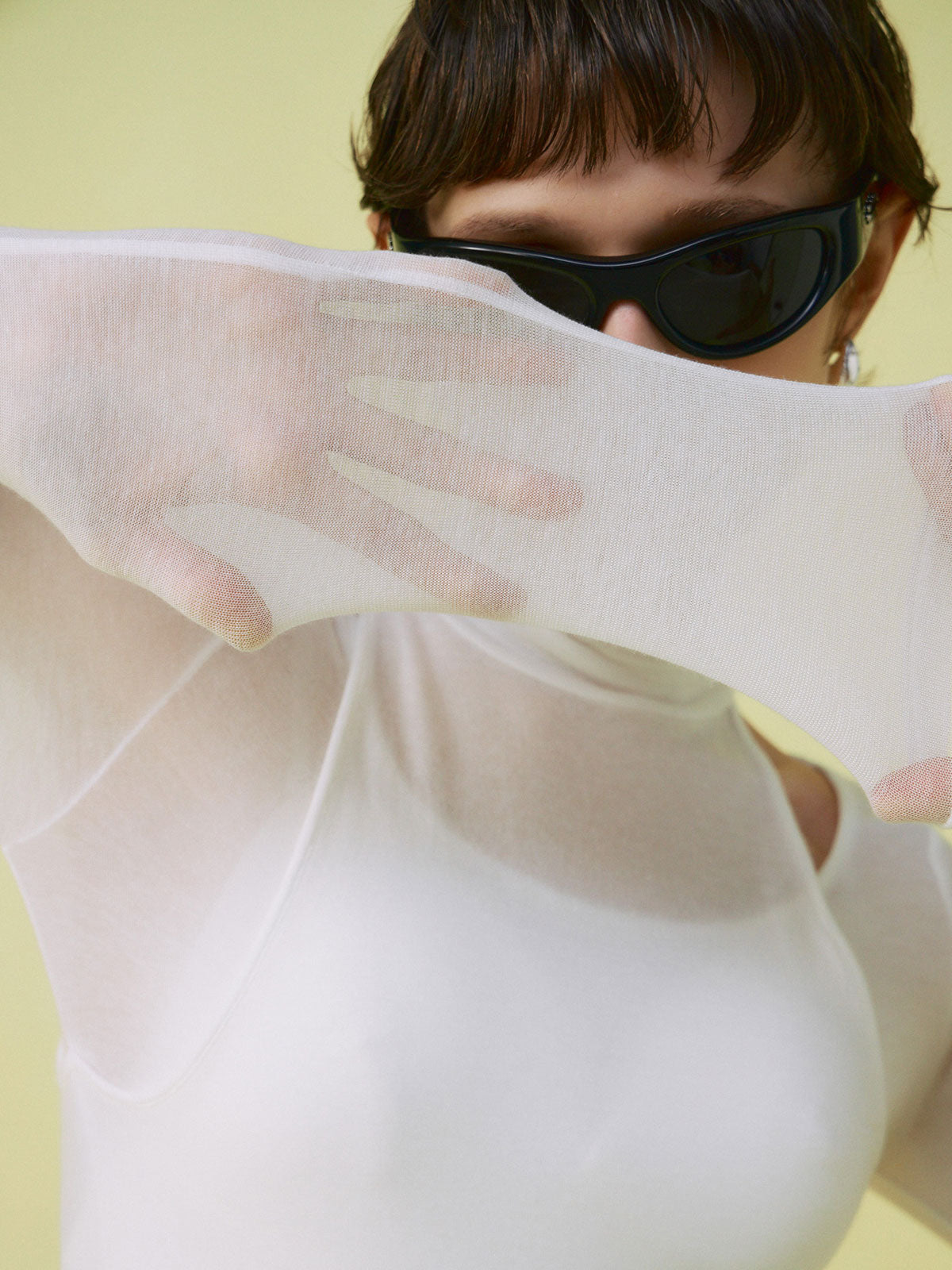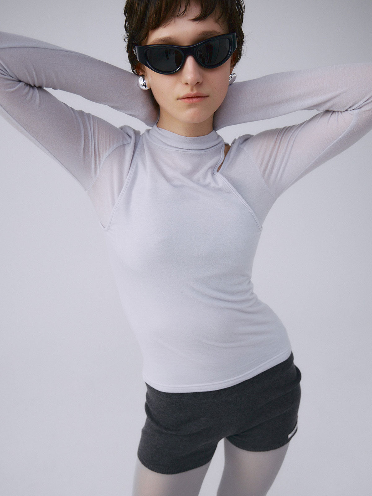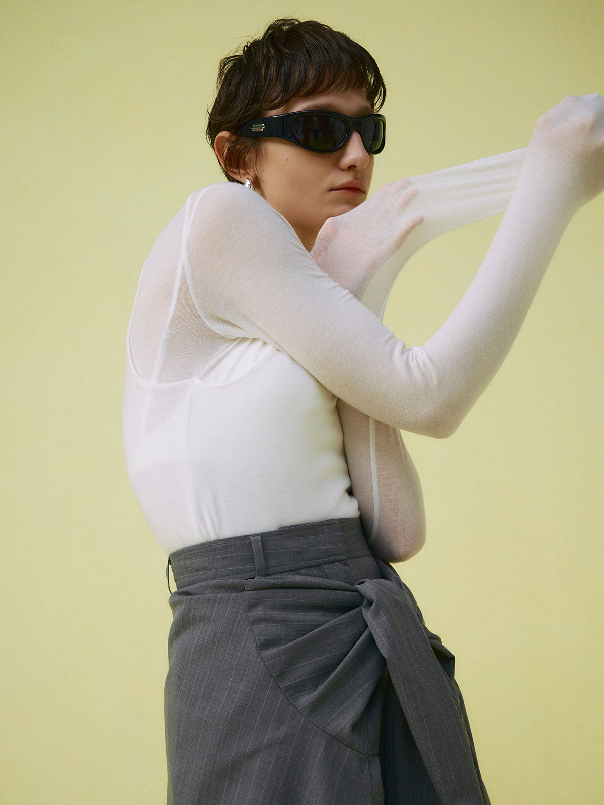 レイヤードしたデザイン、袖部分は程よく透け感がありますが、見頃は2枚仕立てで透けづらく、お下着を気にせず着用いただけます。