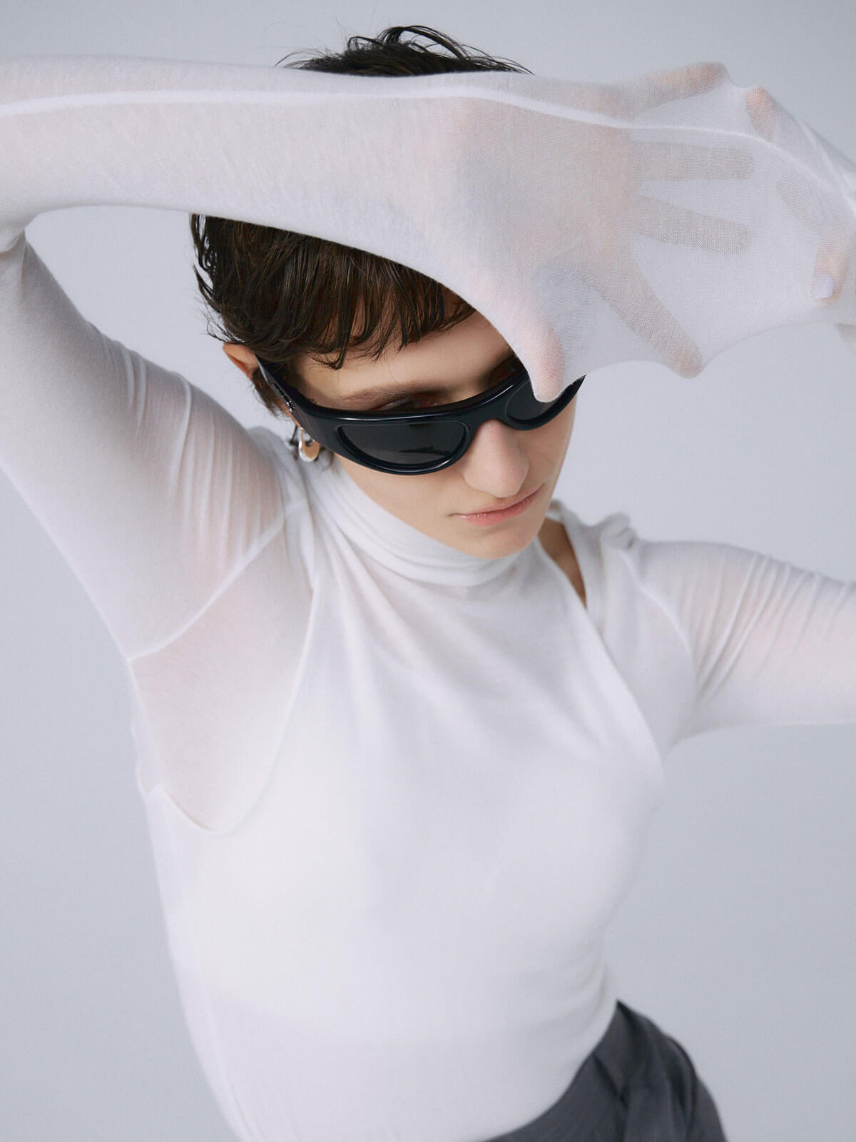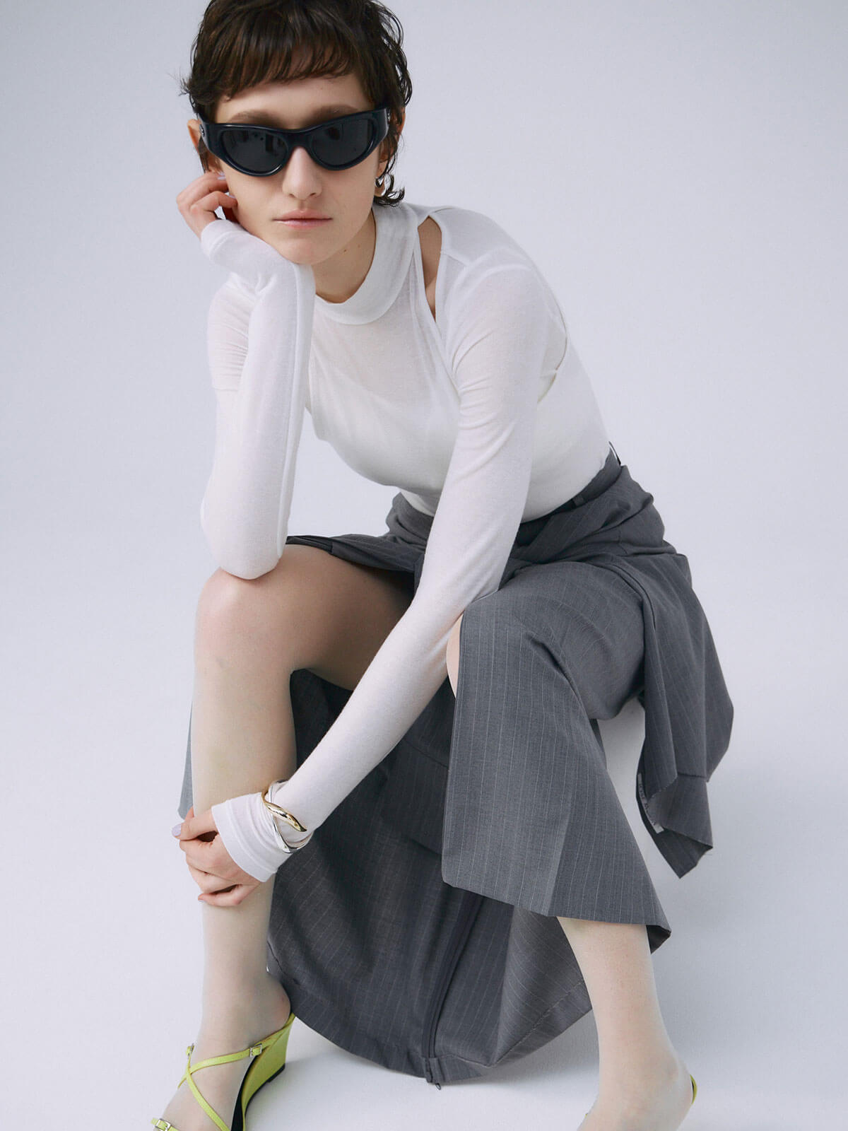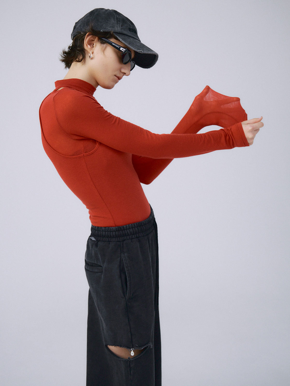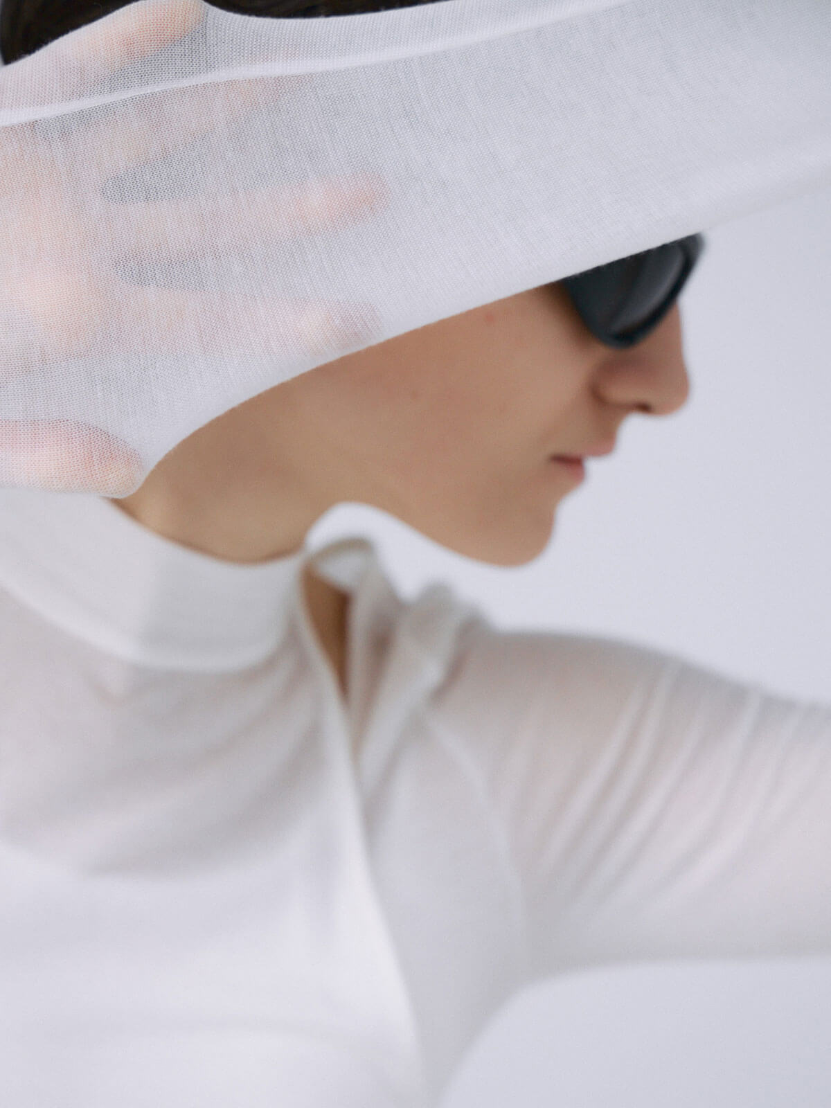 レイヤードしたデザイン、袖部分は程よく透け感がありますが、見頃は2枚仕立てで透けづらく、お下着を気にせず着用いただけます。