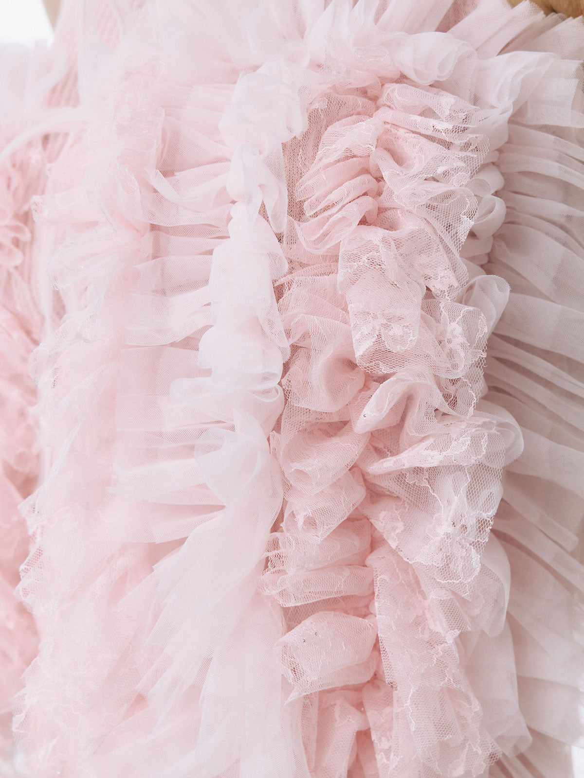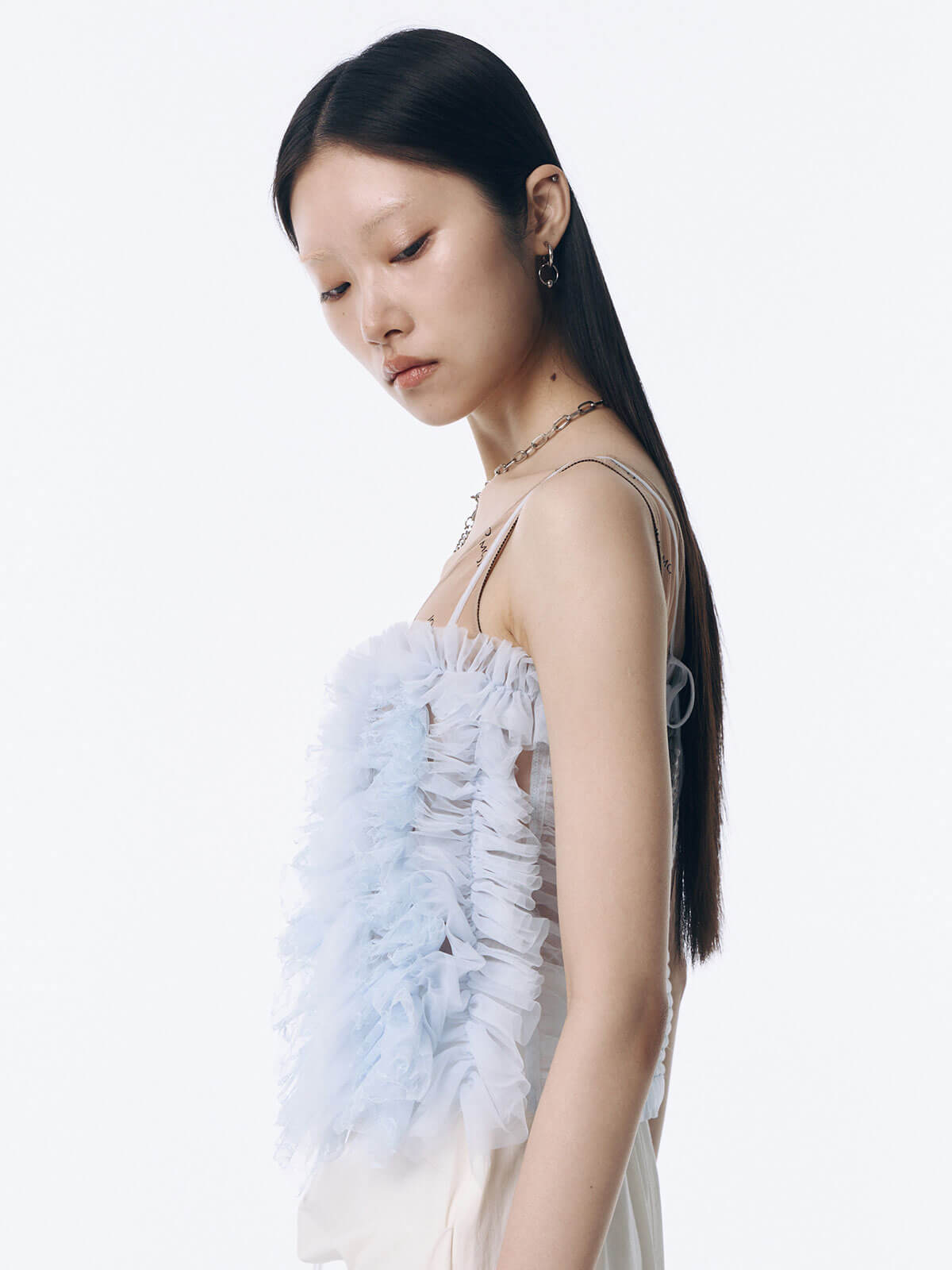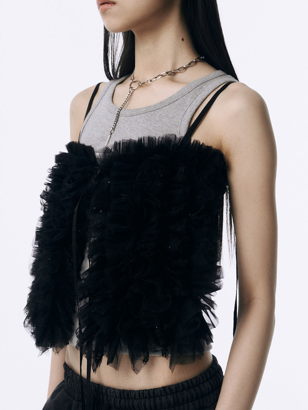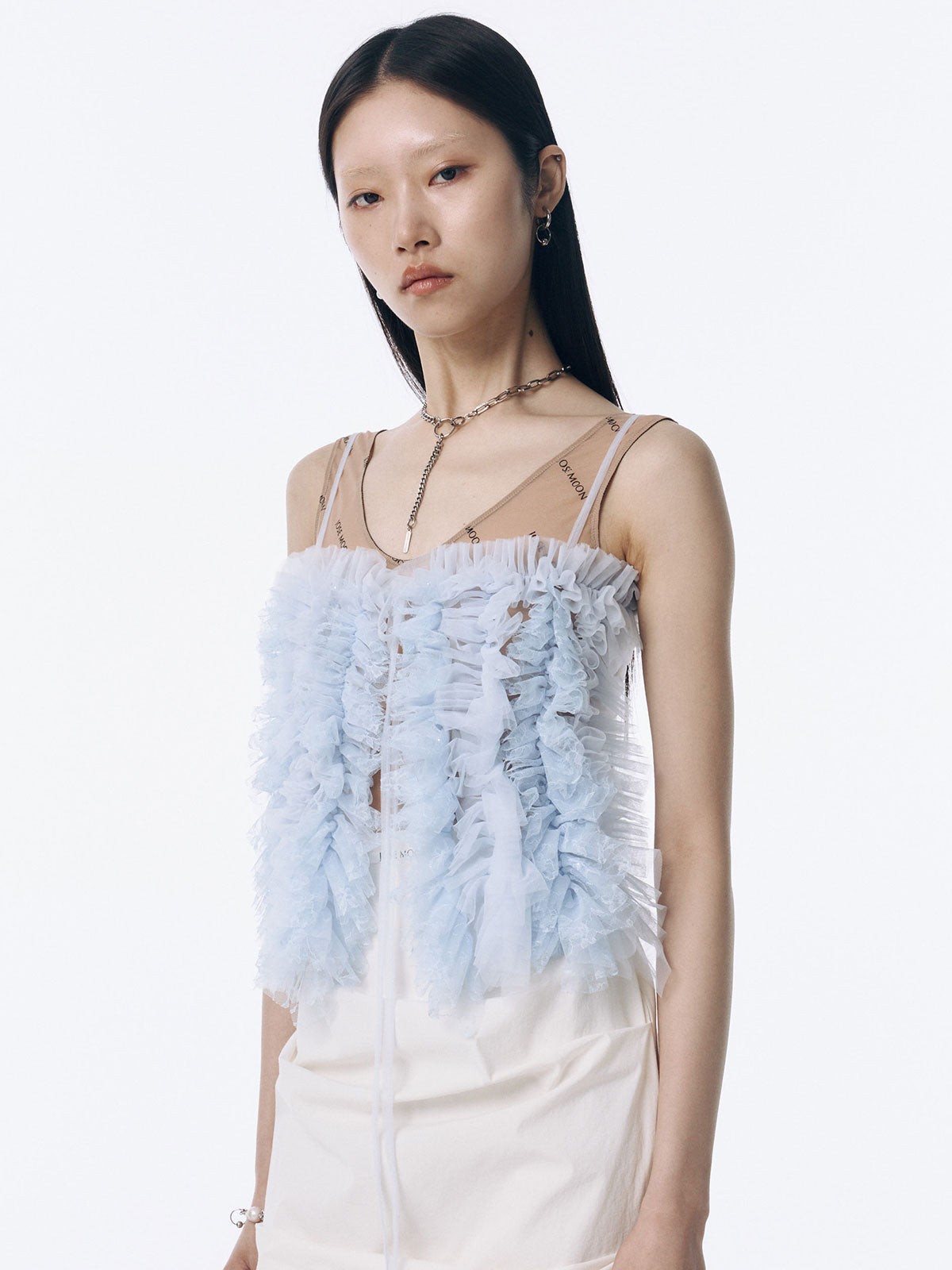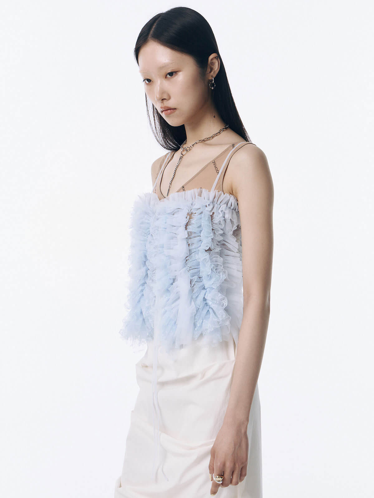 何層にも重なるチュールとレースのフリルを交互にあしらい、フリルの長さに変化をつけ表情を楽しめるレイヤードキャミソール。