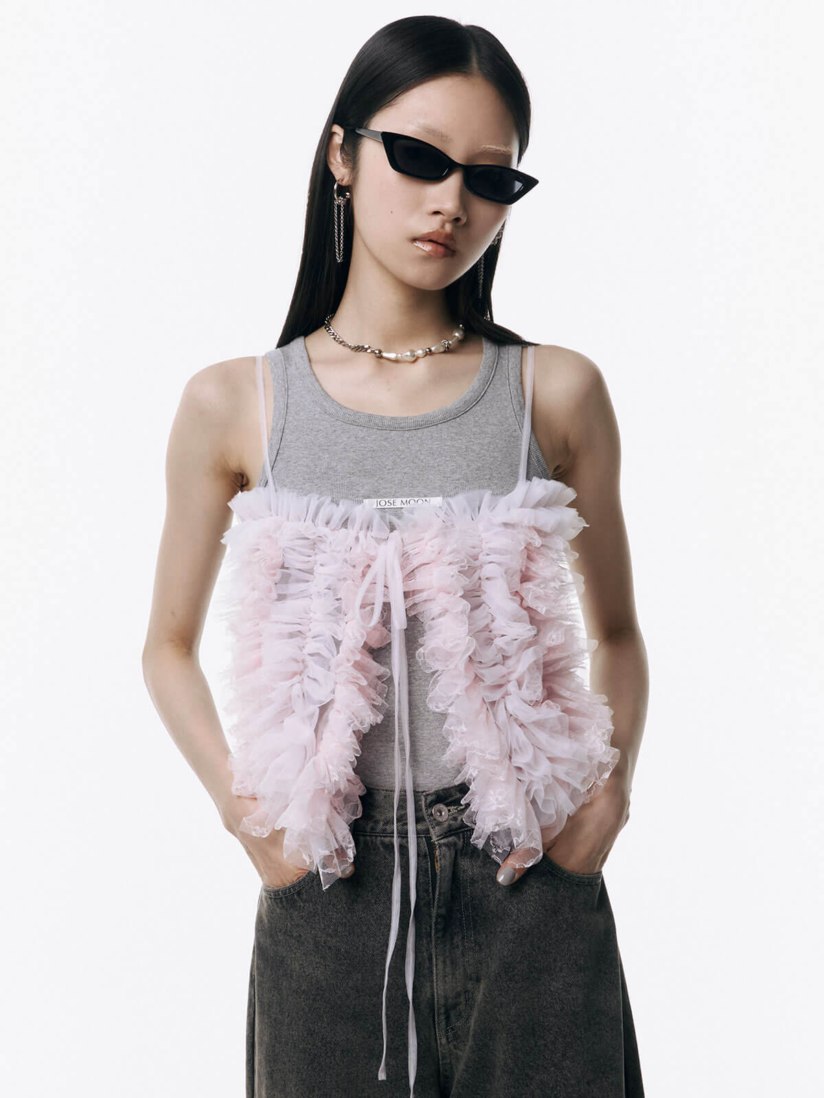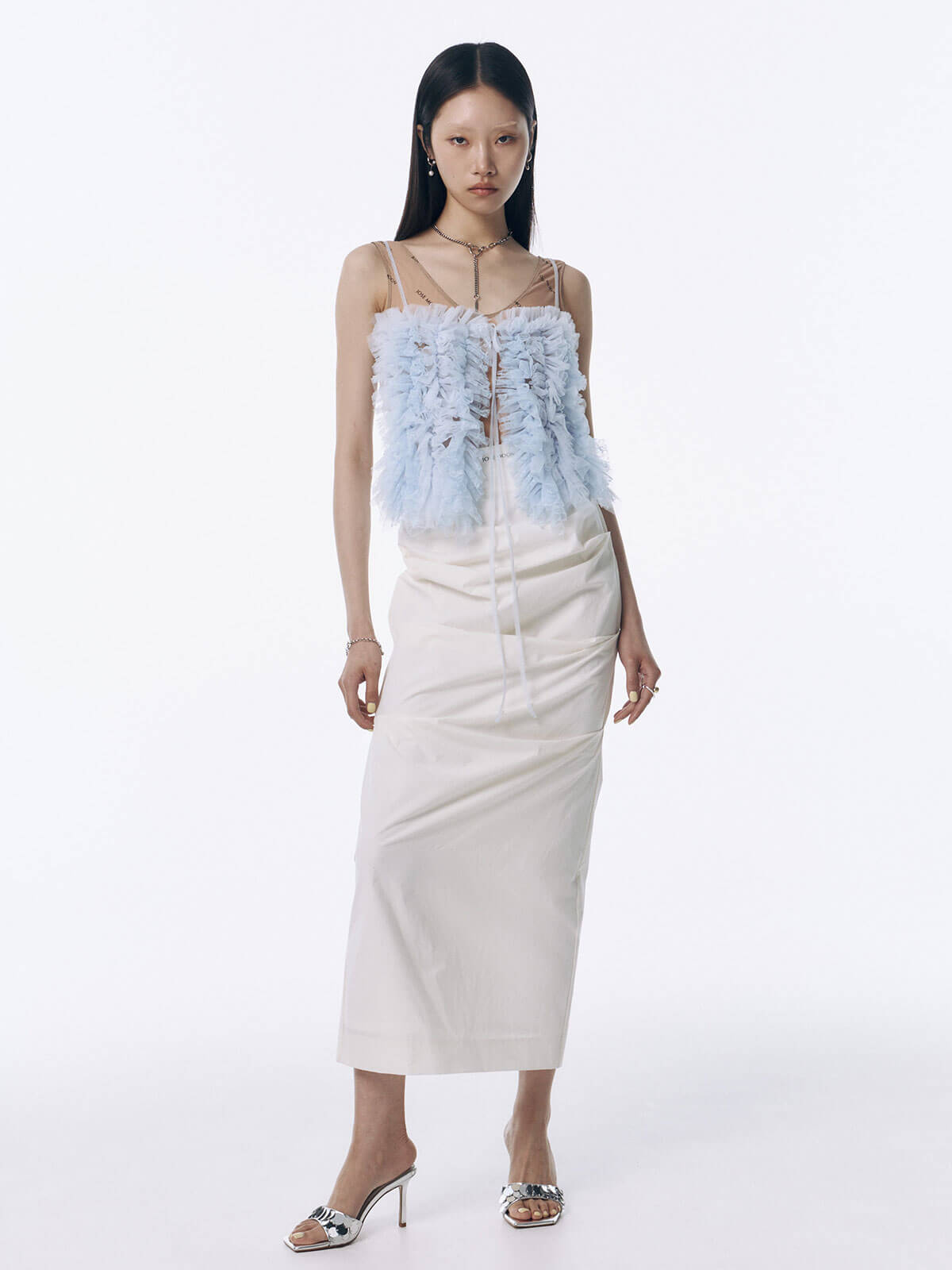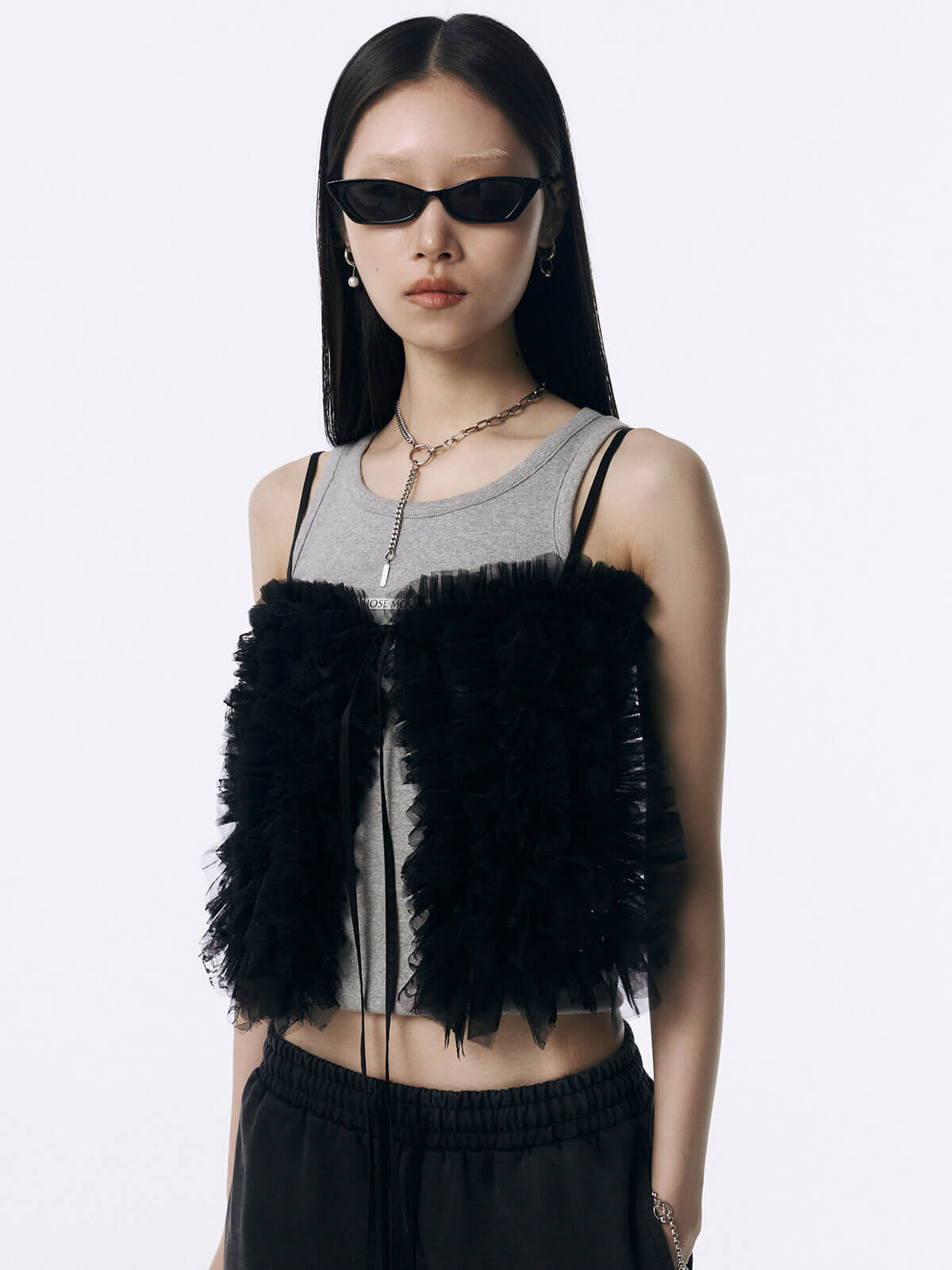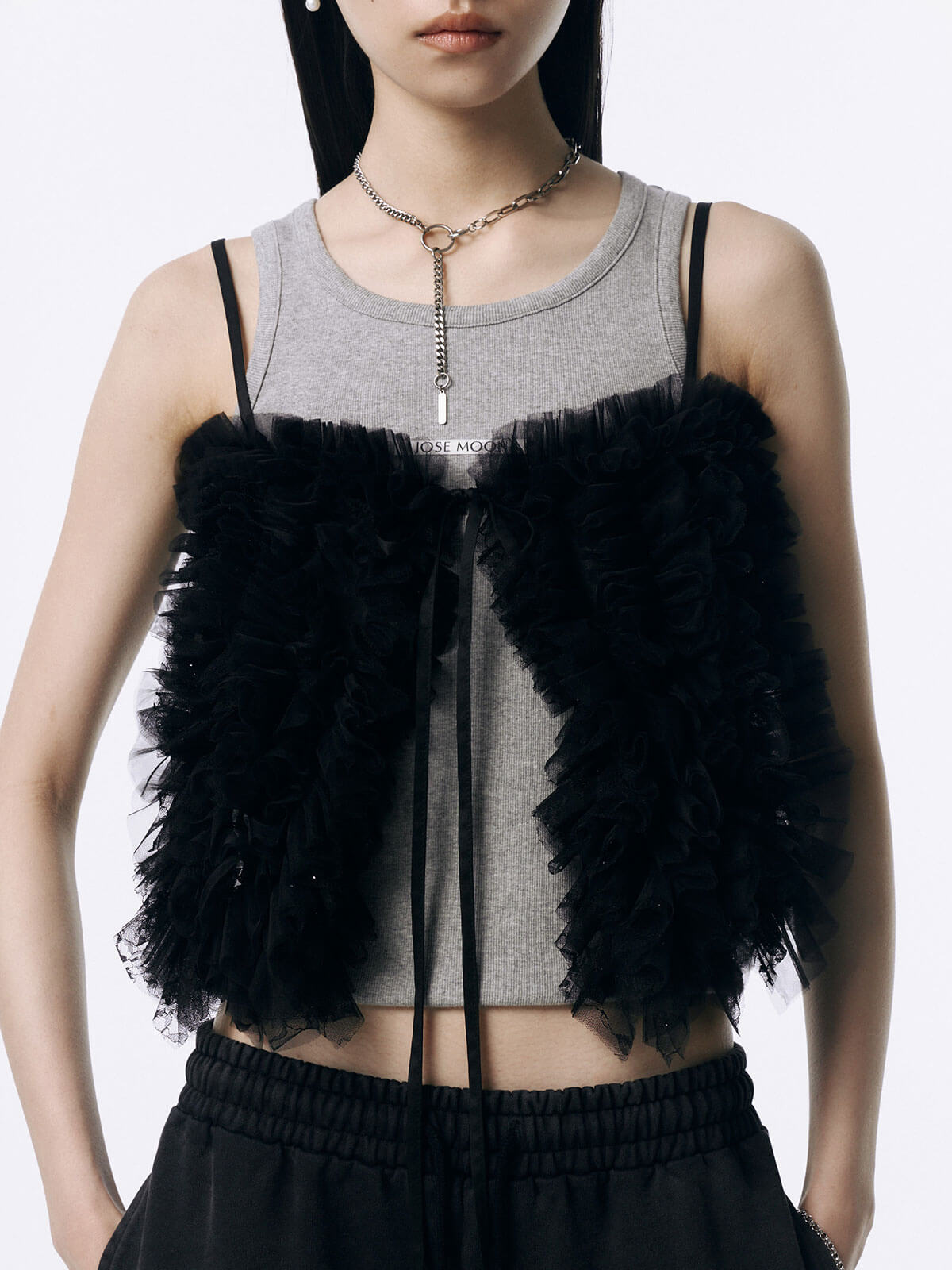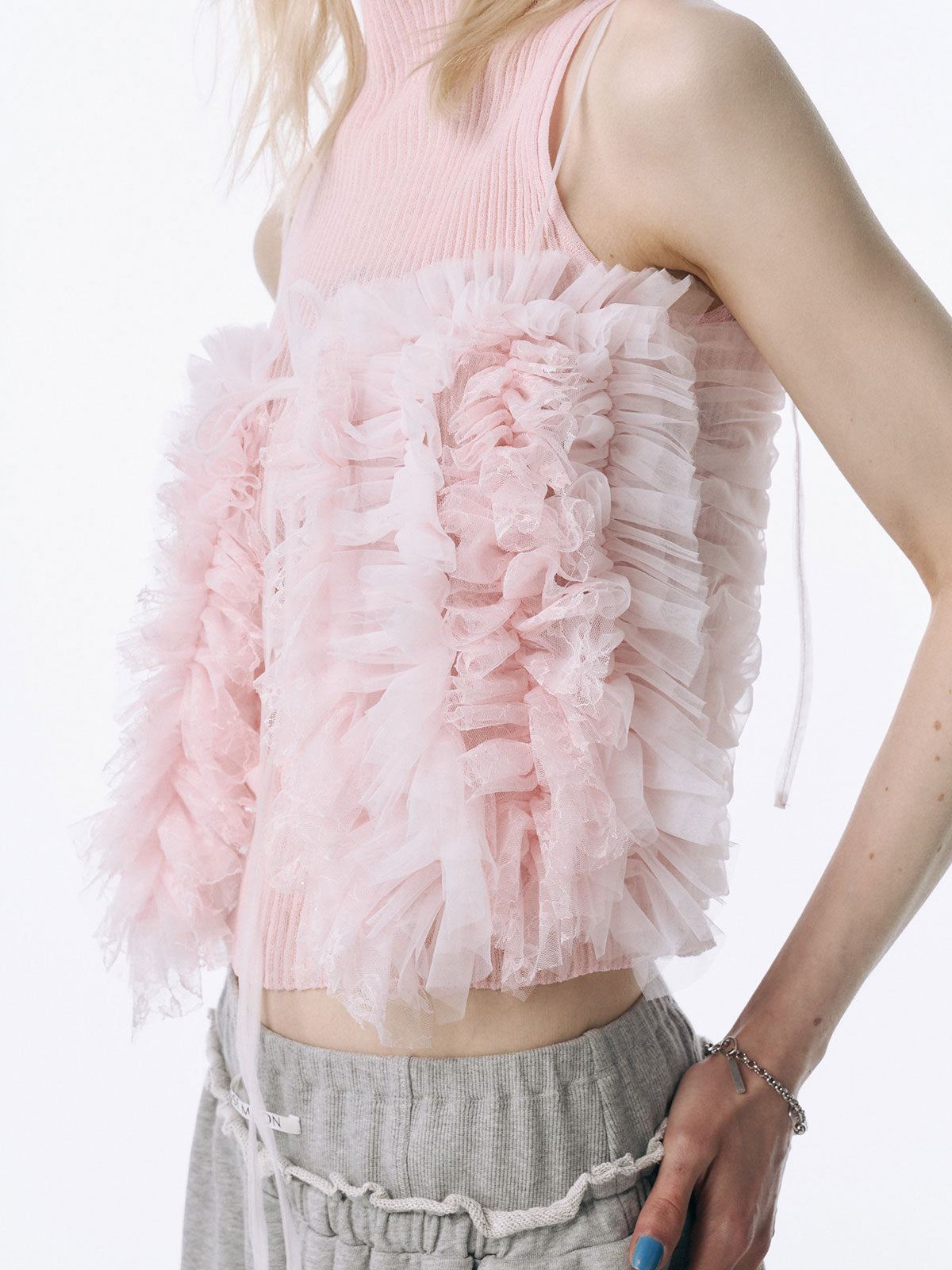 何層にも重なるチュールとレースのフリルを交互にあしらい、フリルの長さに変化をつけ表情を楽しめるレイヤードキャミソール。