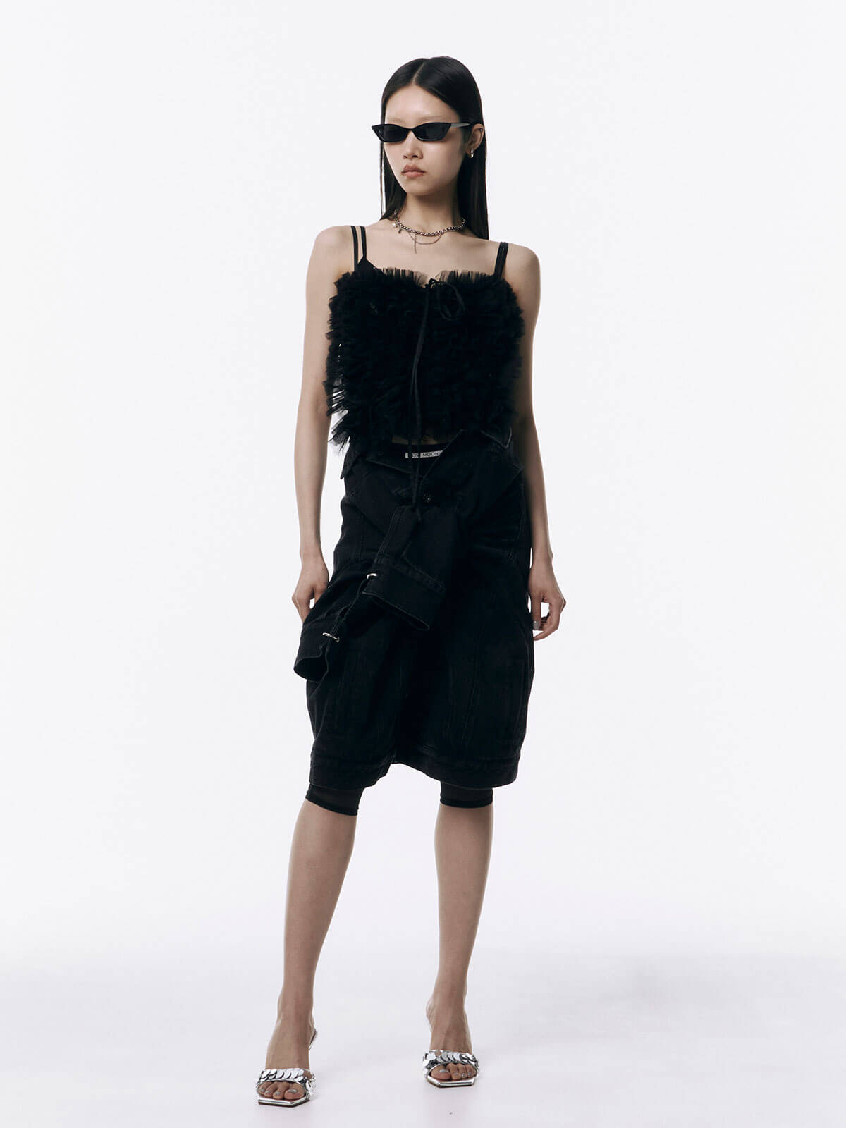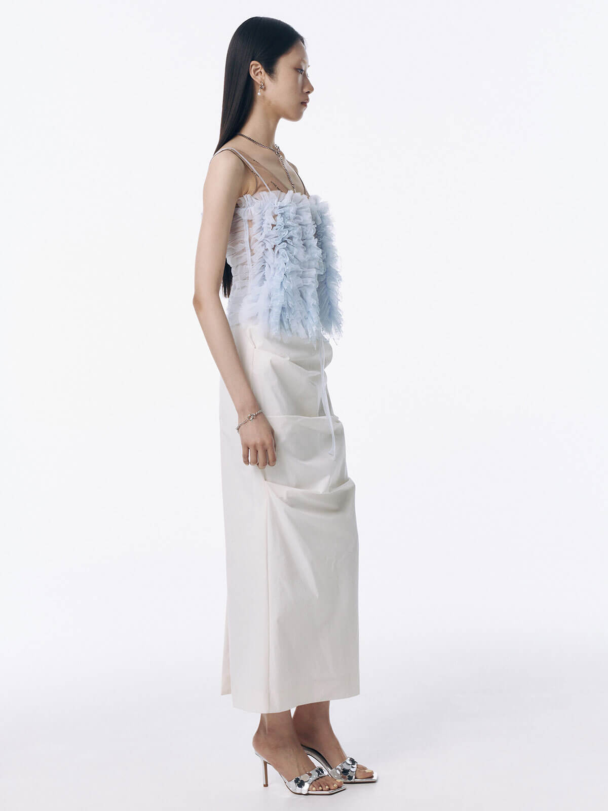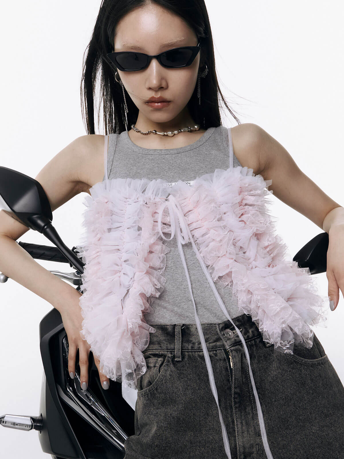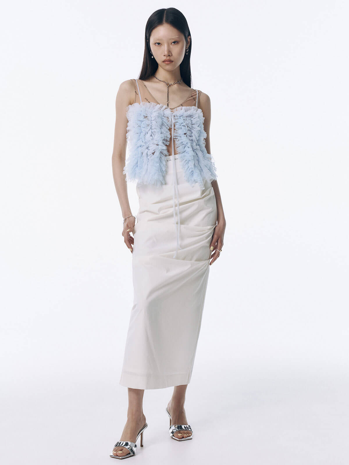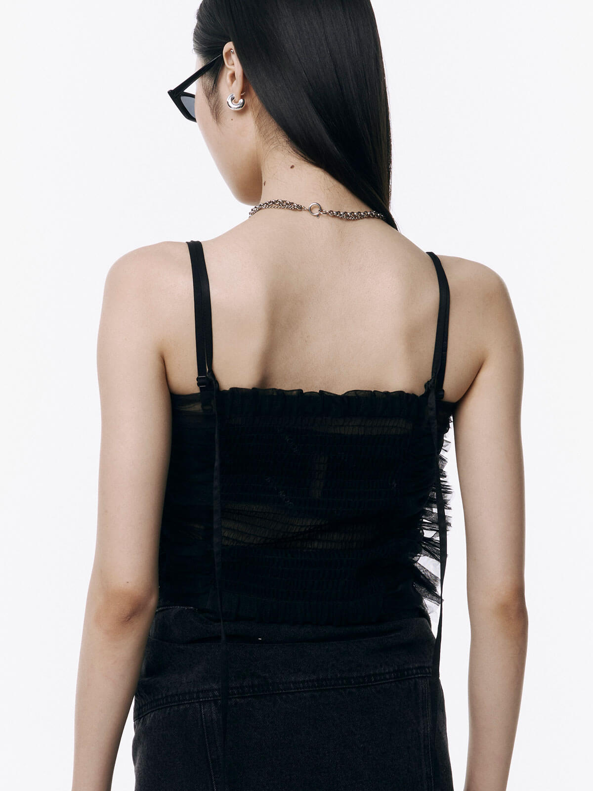 何層にも重なるチュールとレースのフリルを交互にあしらい、フリルの長さに変化をつけ表情を楽しめるレイヤードキャミソール。