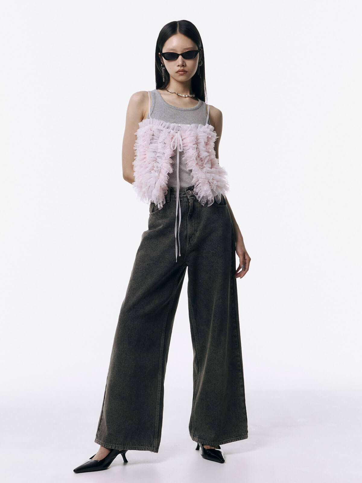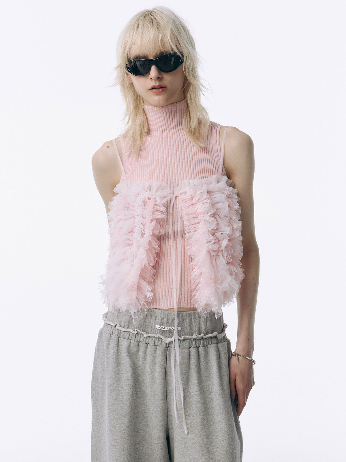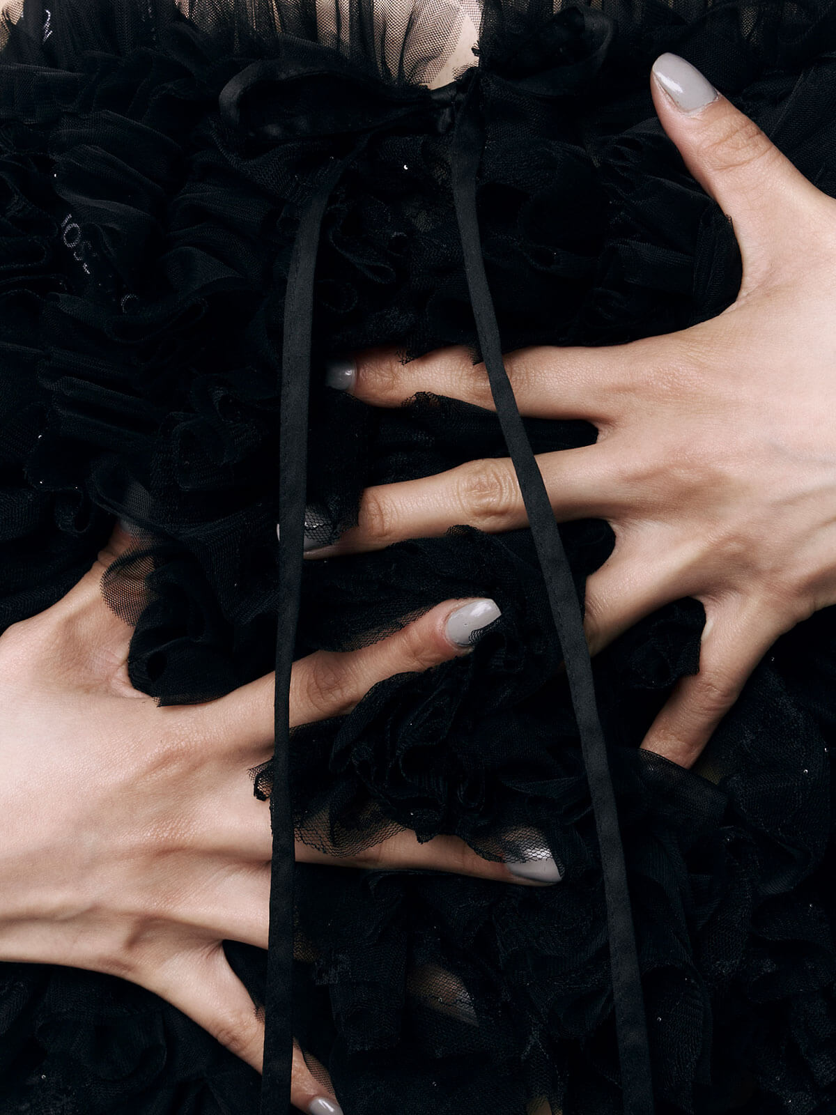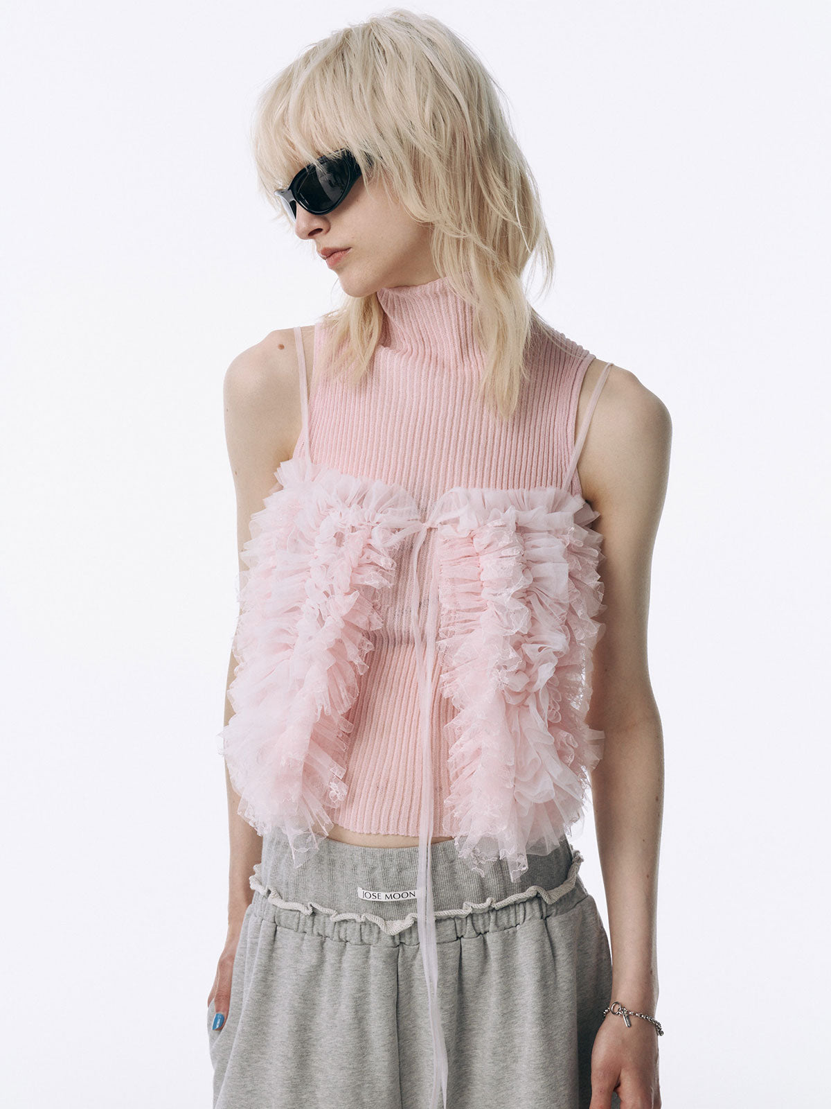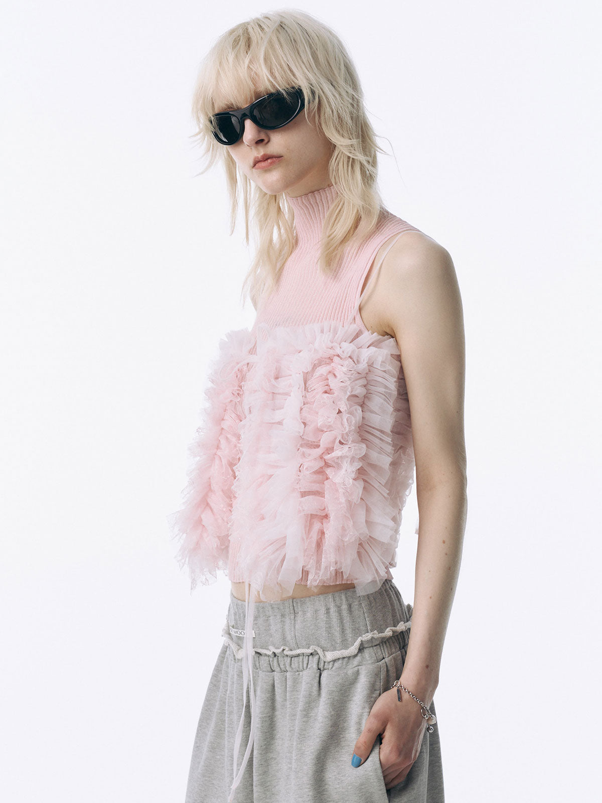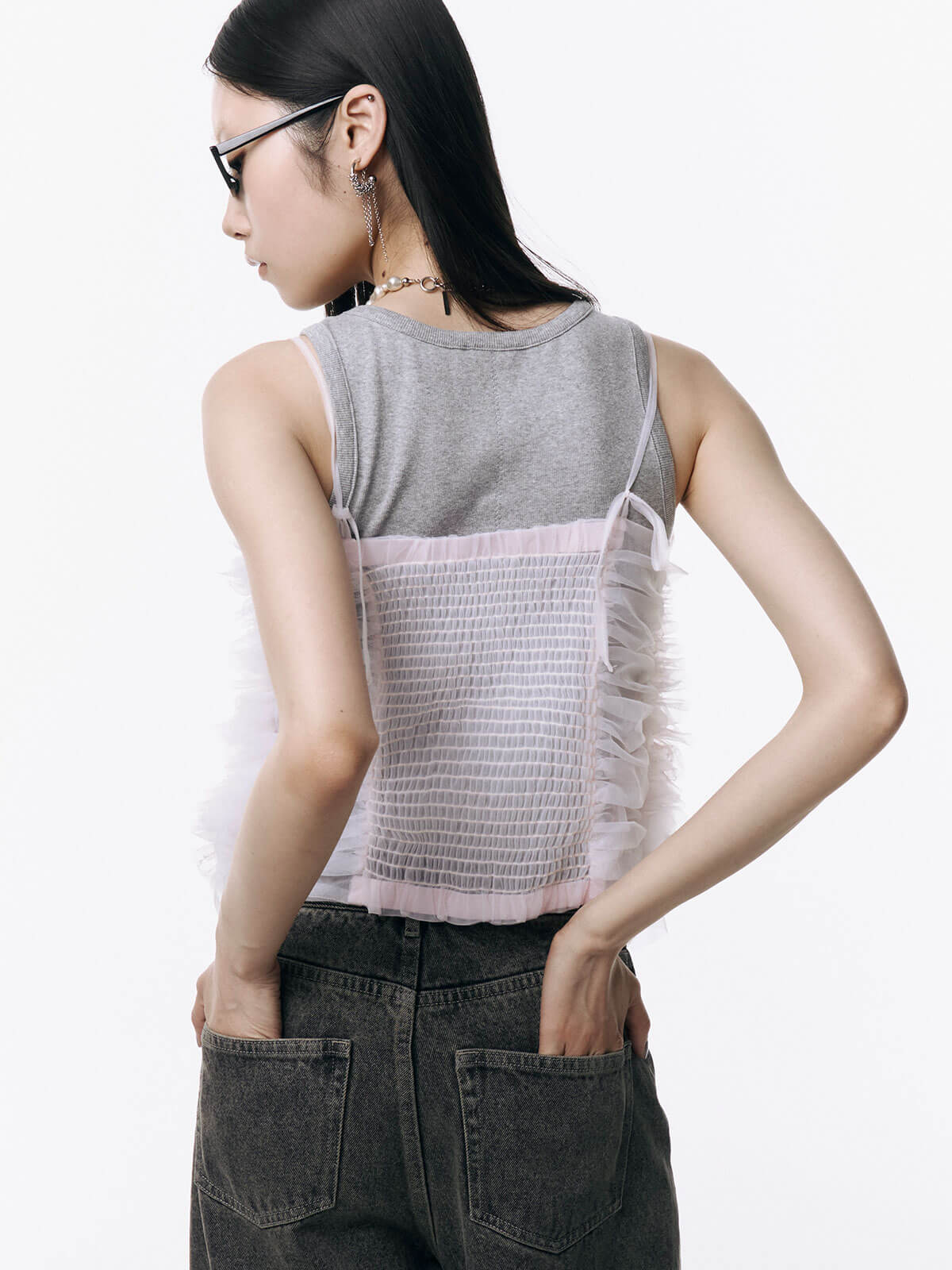 何層にも重なるチュールとレースのフリルを交互にあしらい、フリルの長さに変化をつけ表情を楽しめるレイヤードキャミソール。