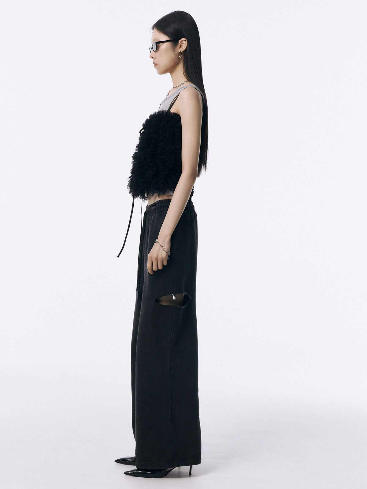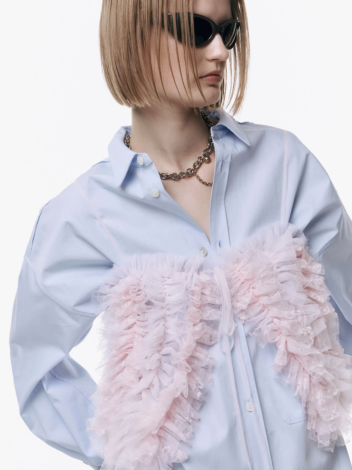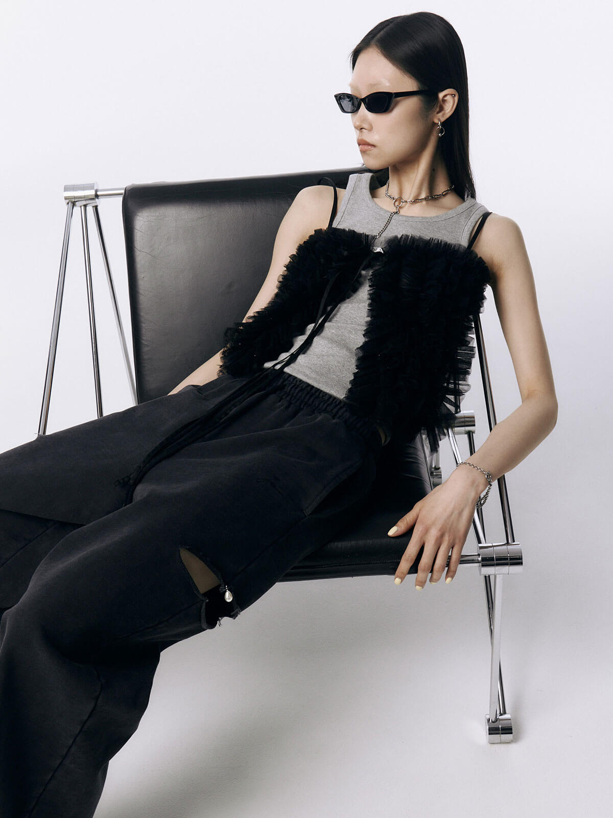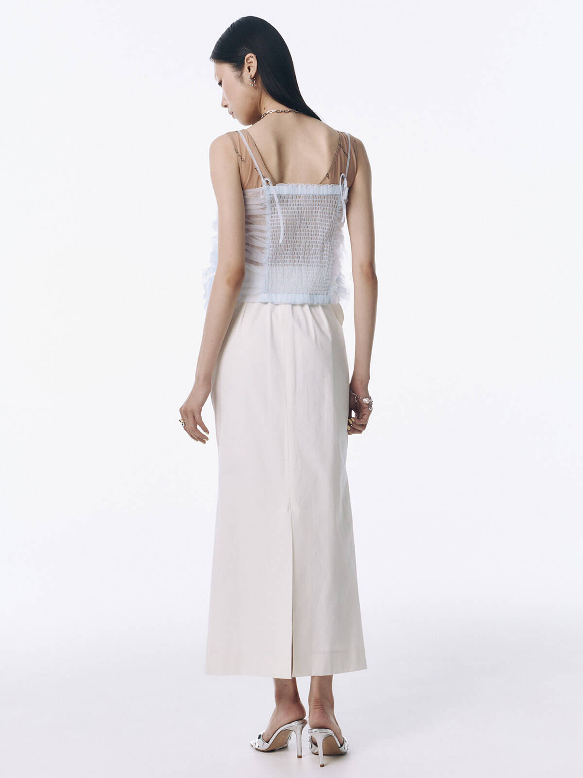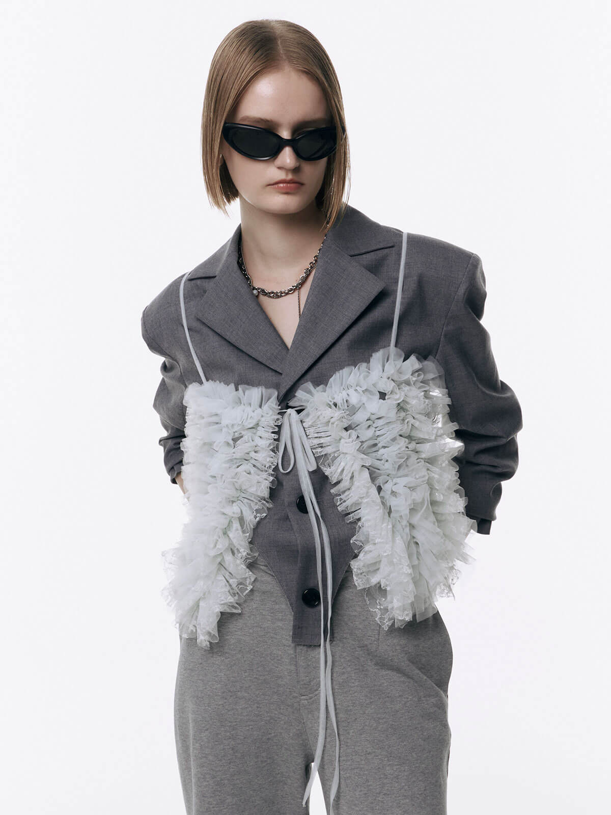 何層にも重なるチュールとレースのフリルを交互にあしらい、フリルの長さに変化をつけ表情を楽しめるレイヤードキャミソール。