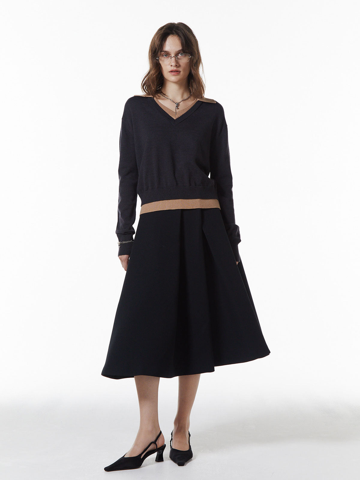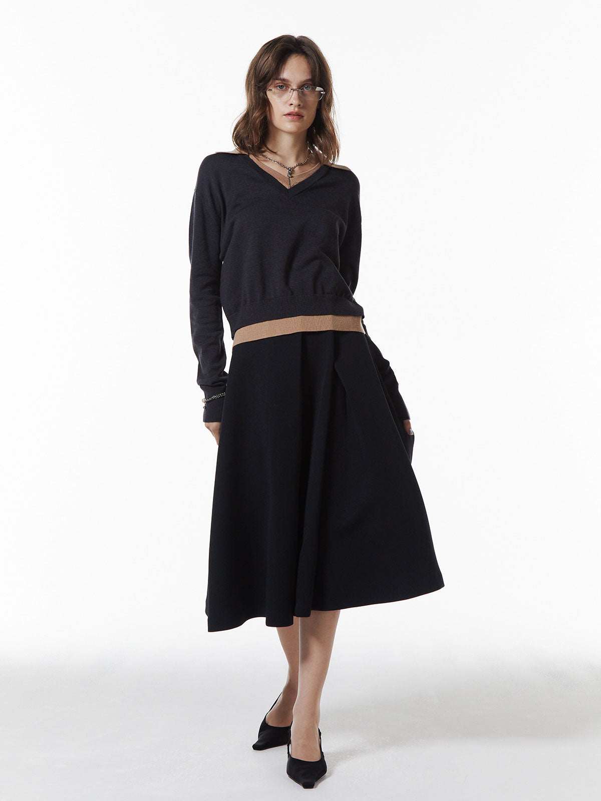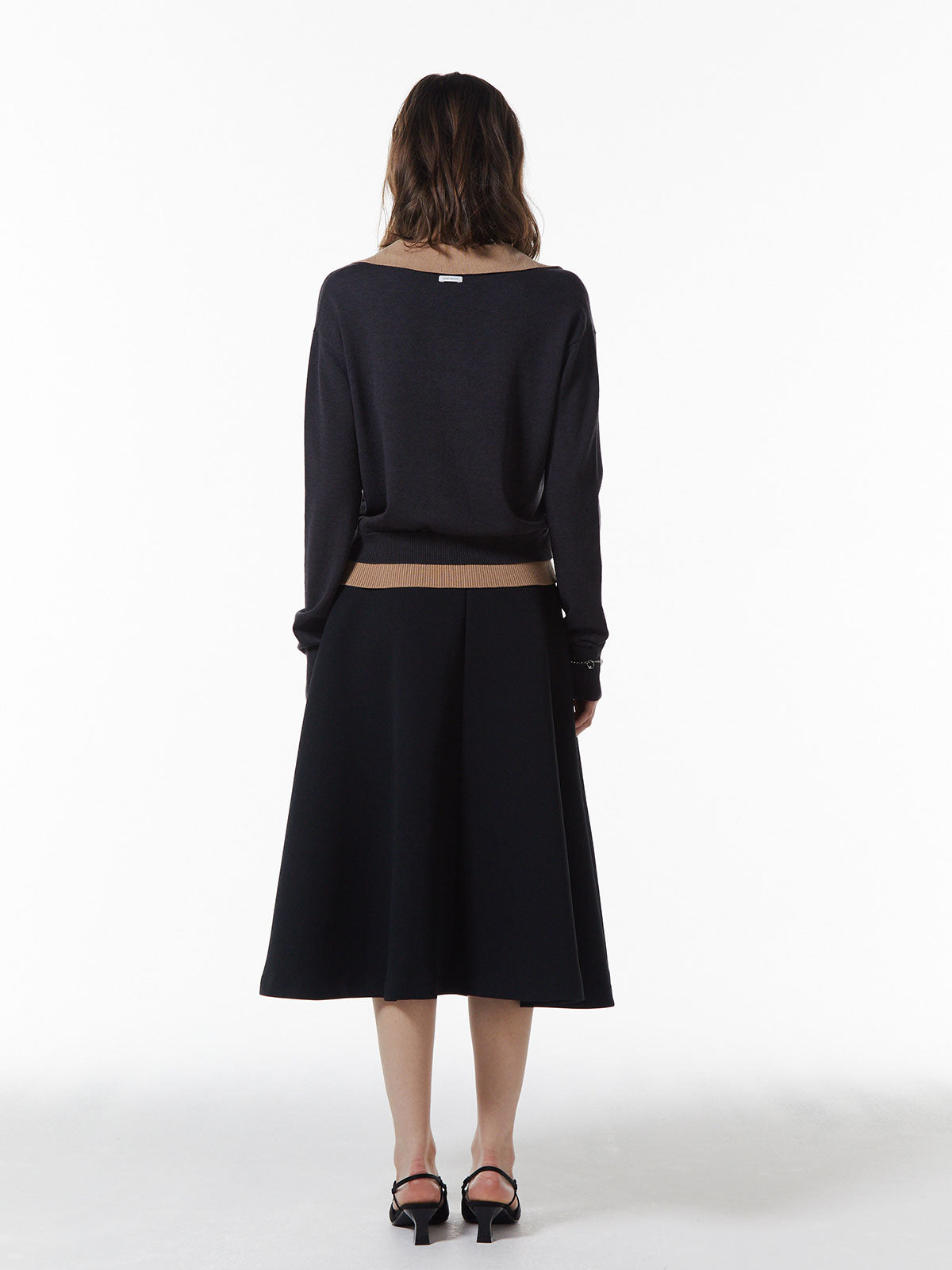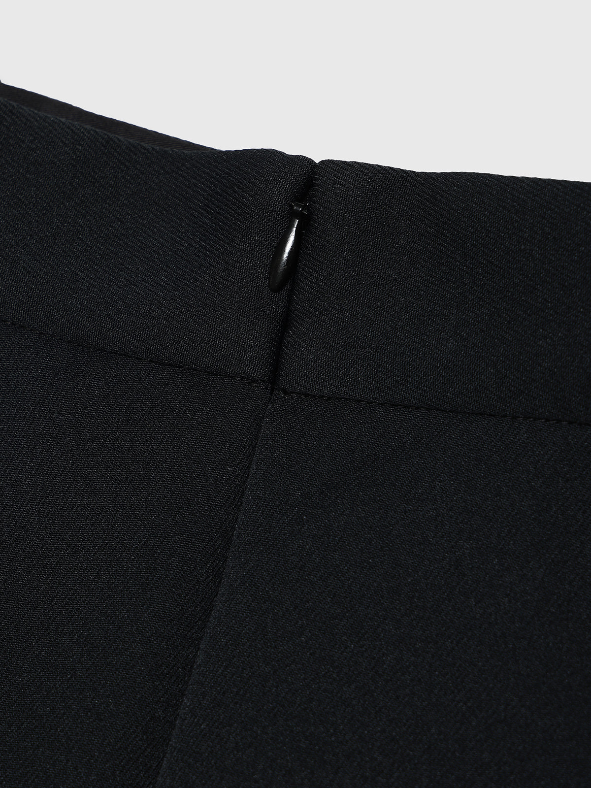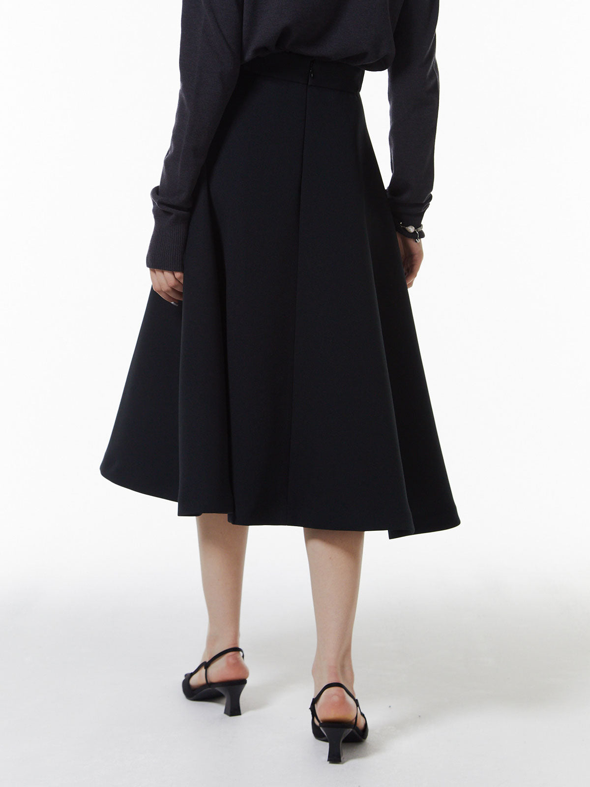 着るだけで自然と立体的なラインが生まれ、アシンメトリーの深めのタックが美しく広がるフレアラインが印象的です。