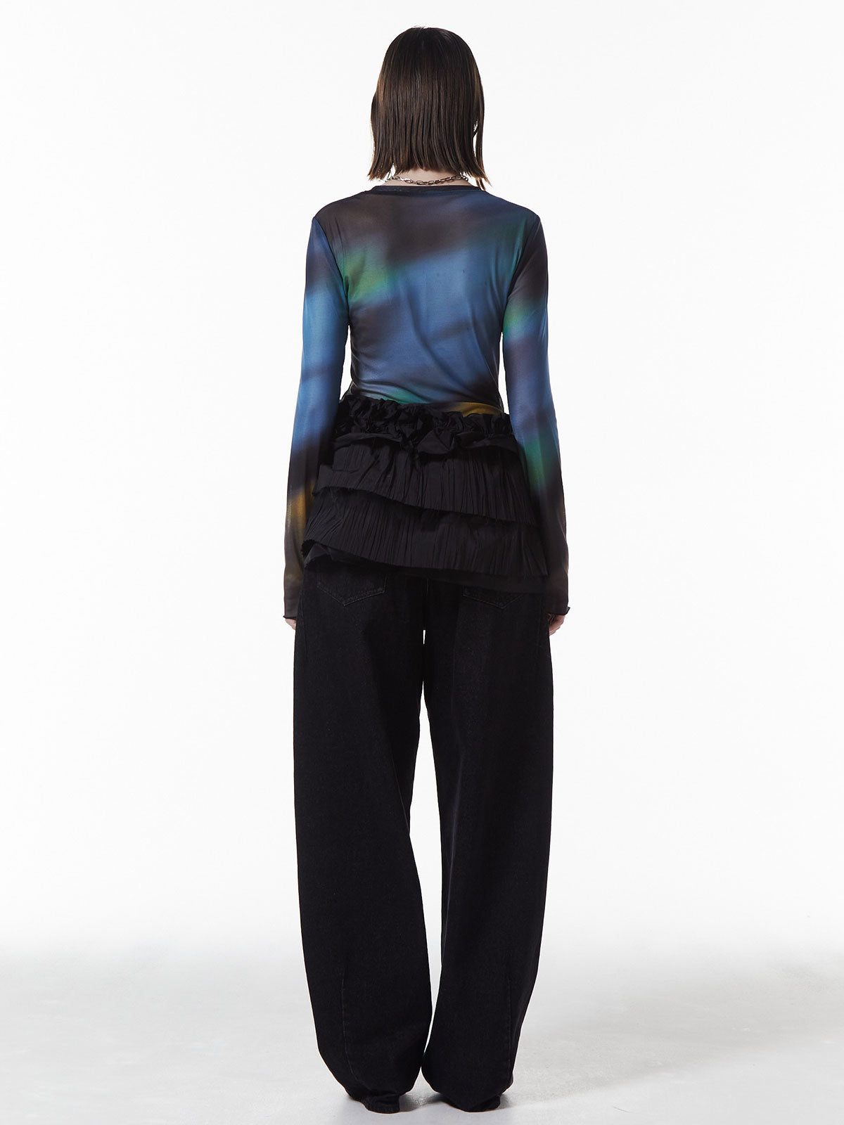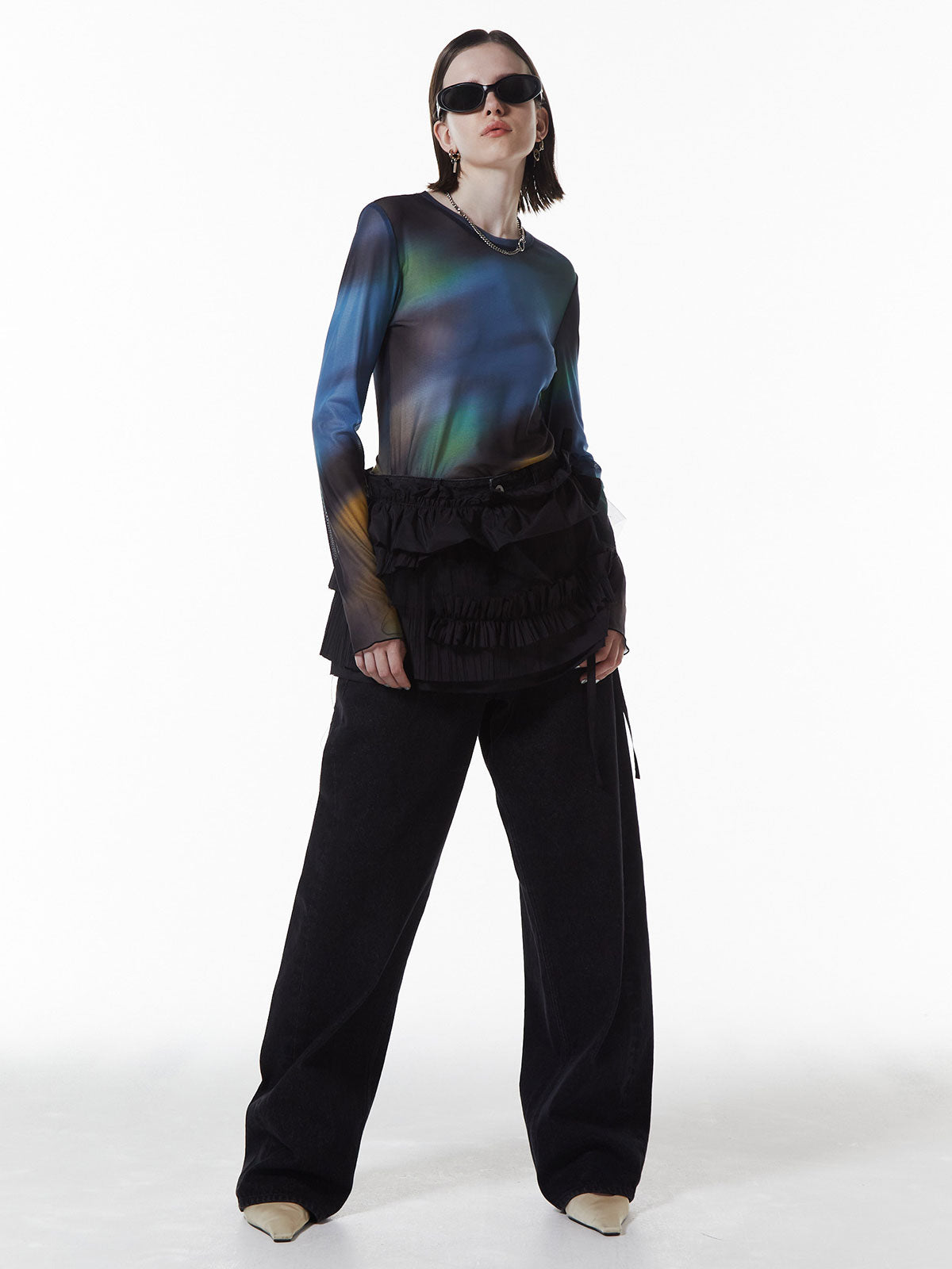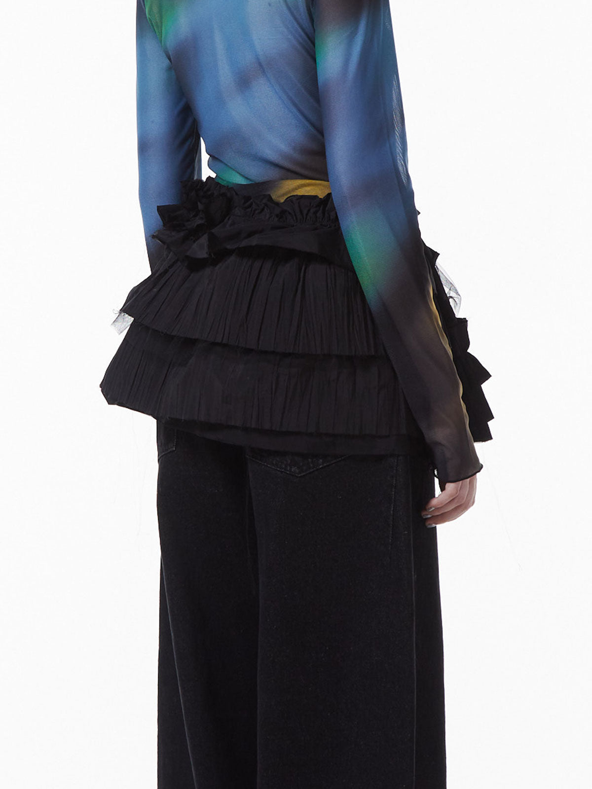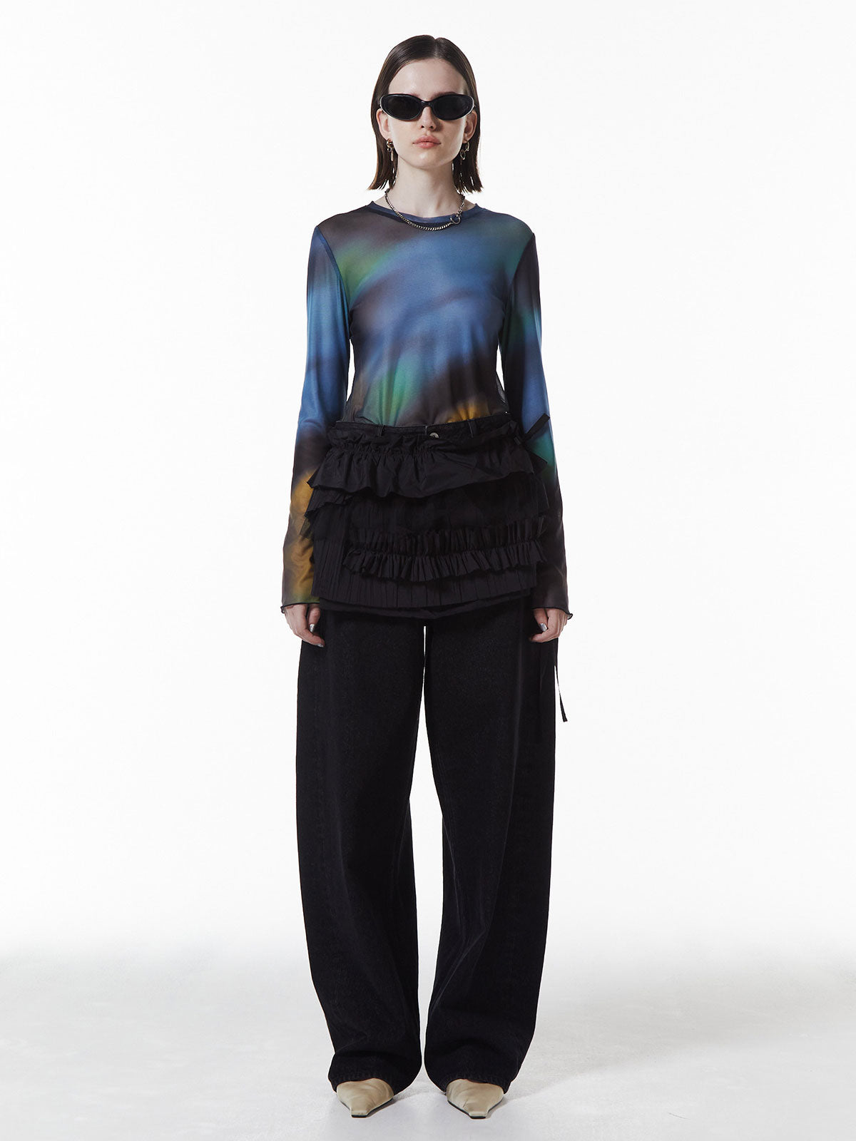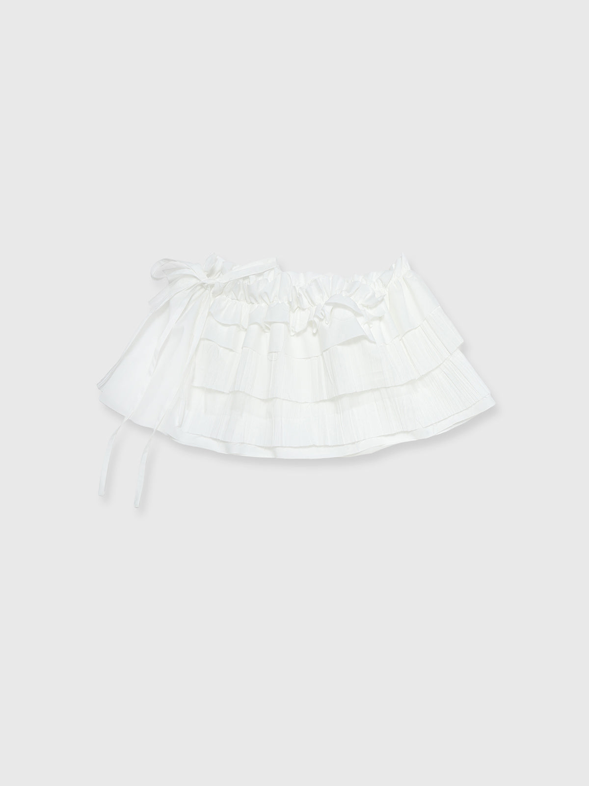 ウエストはスッキリとしたフラット仕様でヒップ周りをさりげなくカバーしながら動きに合わせて揺れる裾が立体感を生み出しスタイリングに奥行きを与えます。