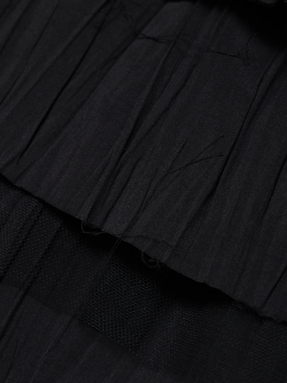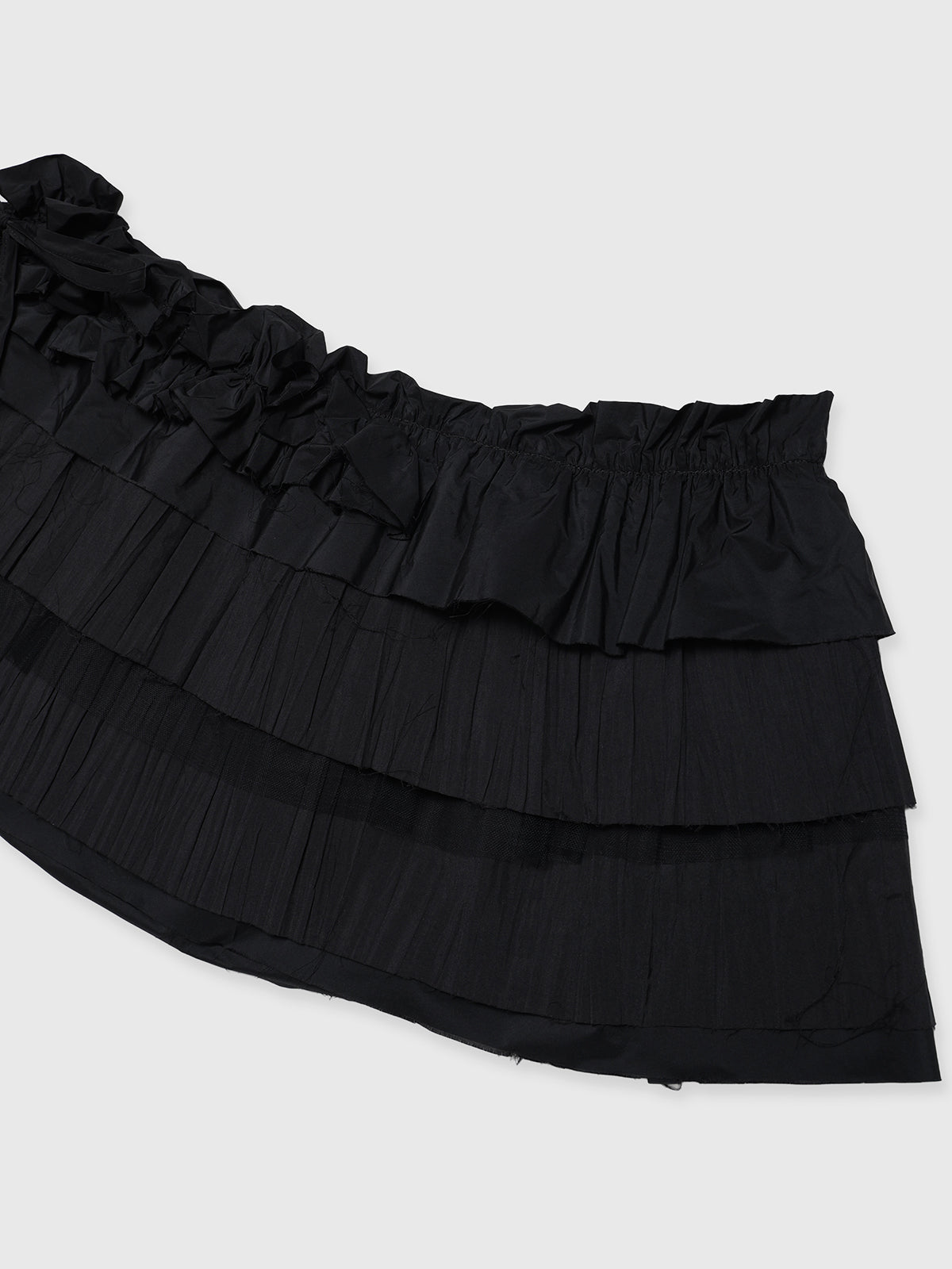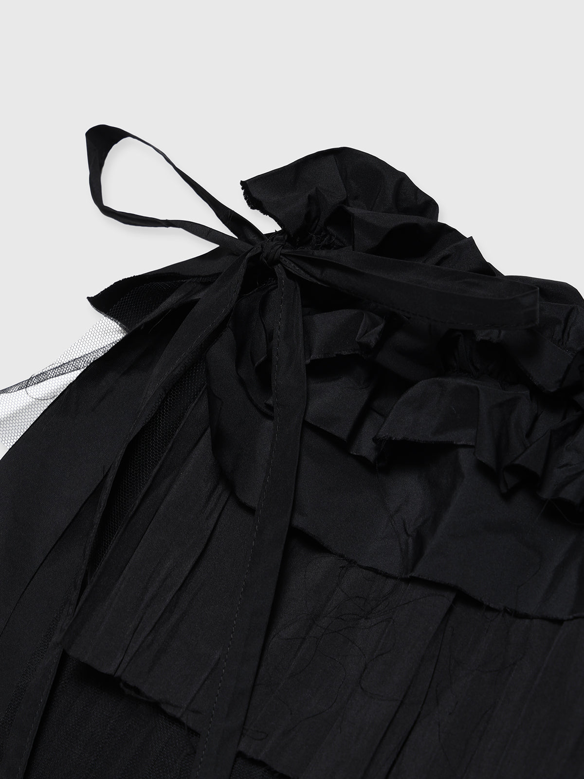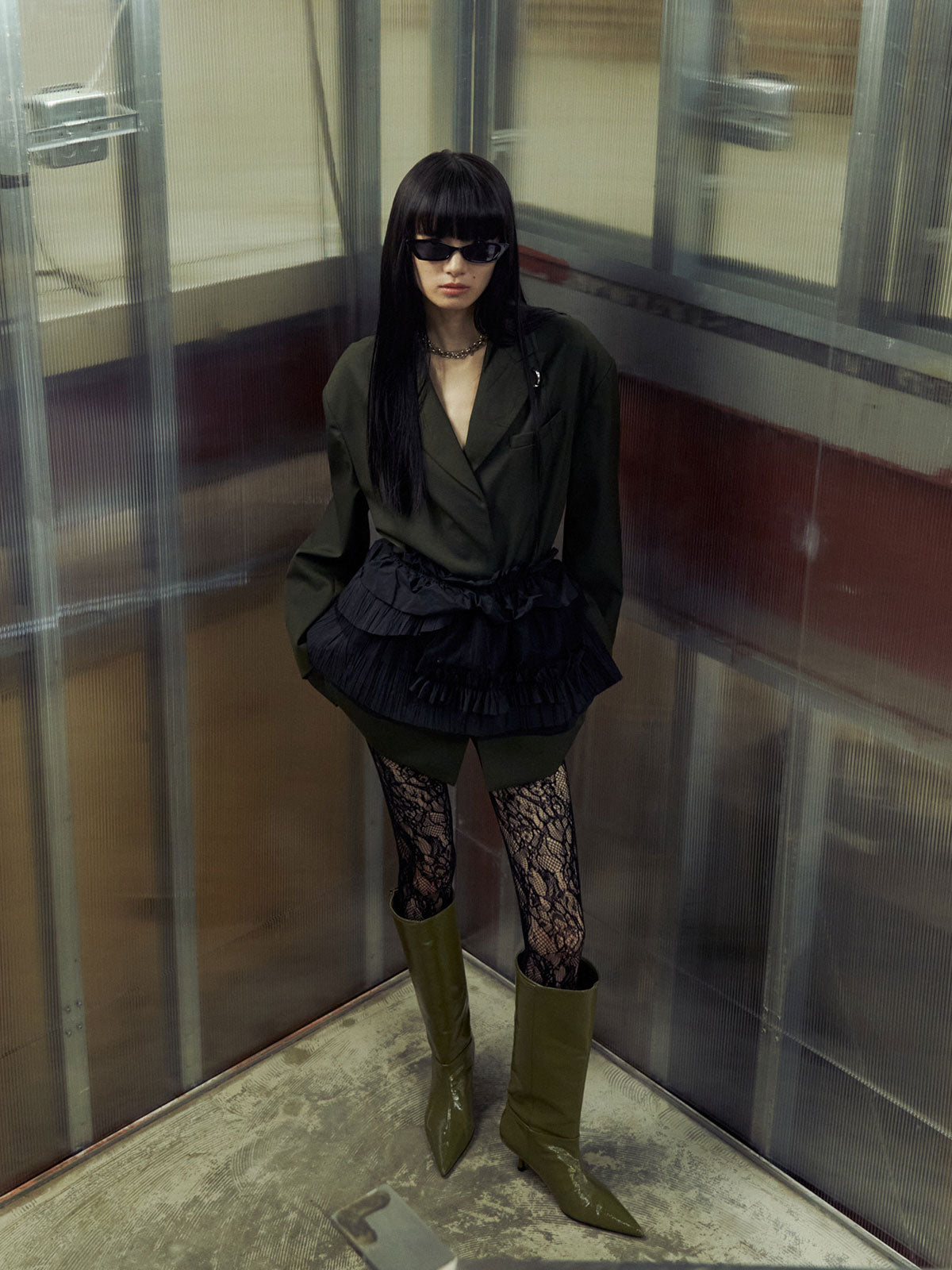 シルエットにアクセントを添える繊細なフリルディテールが、モードな中に甘さを宿す絶妙なバランスを演出します。