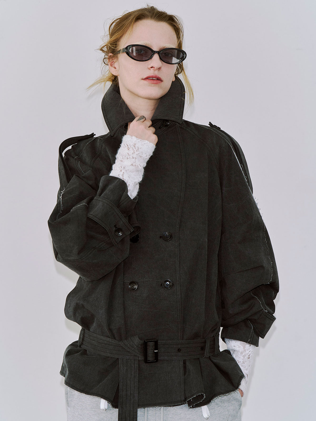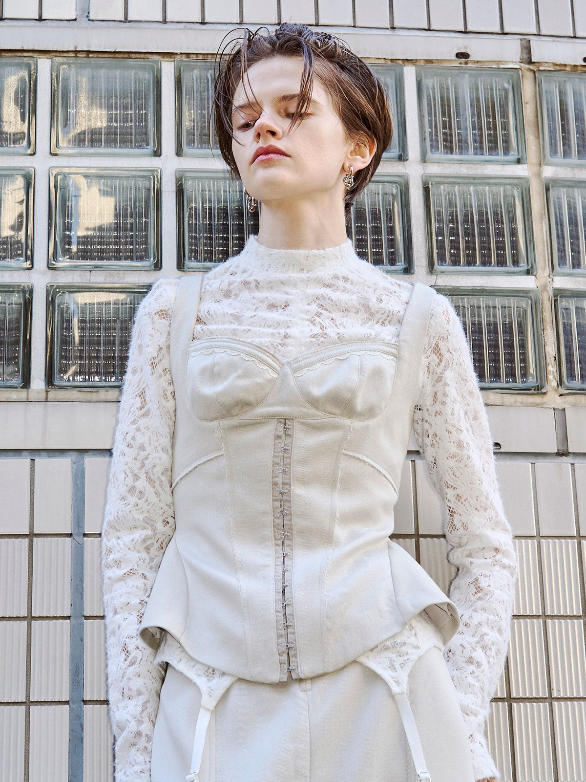 コンパクトなシルエットに仕上げつ、裾はコルセットを思わせるヘムラインでモード感をプラス。