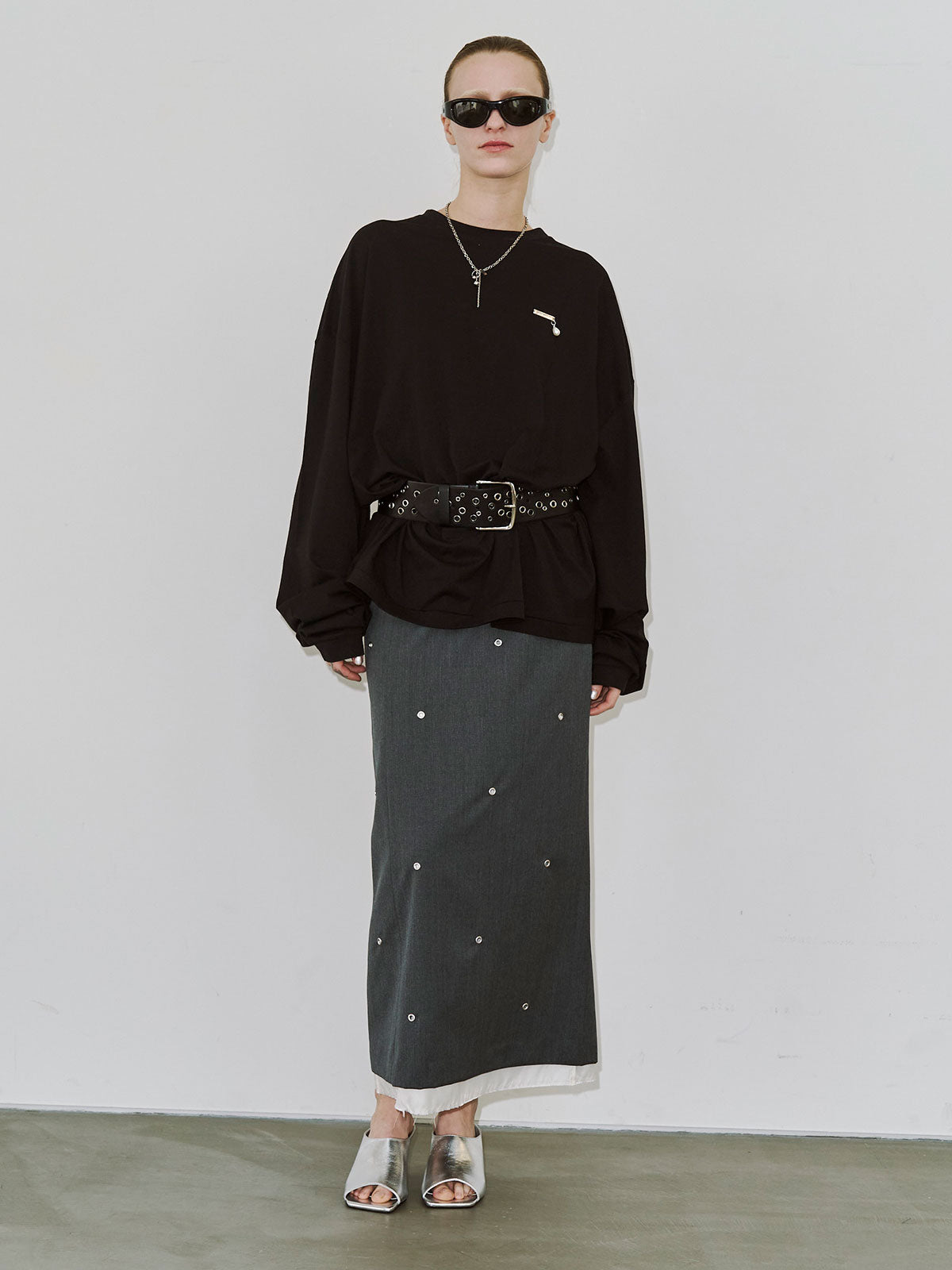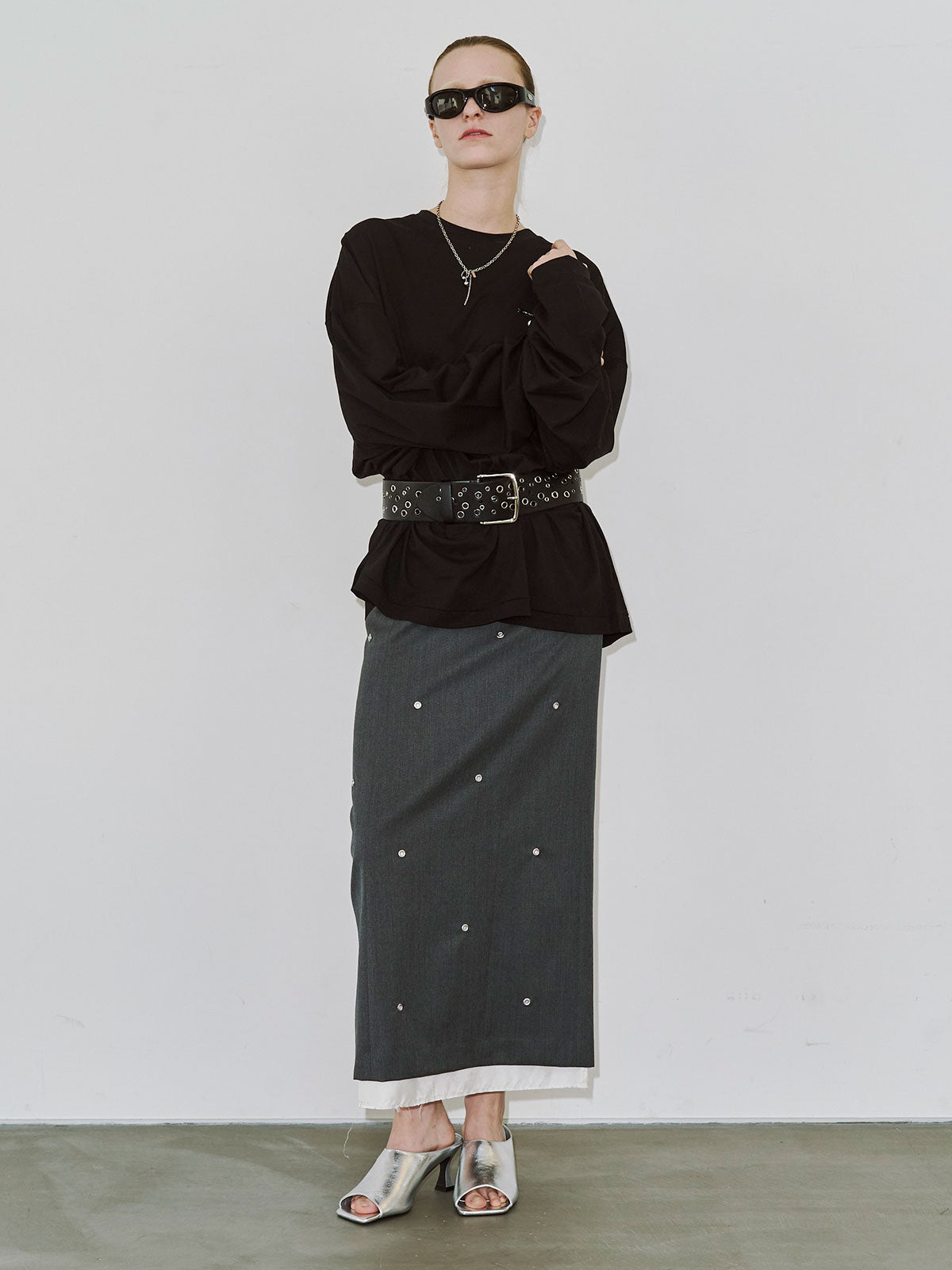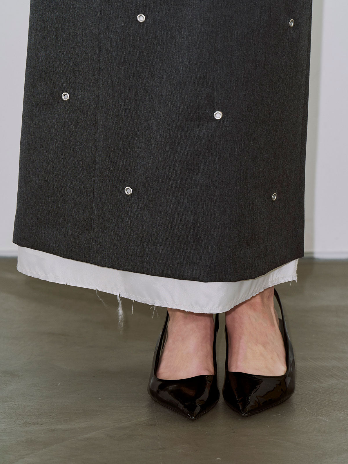 全体にハトメを打ち込み、ミニマルなシルエットにエッジをプラス。