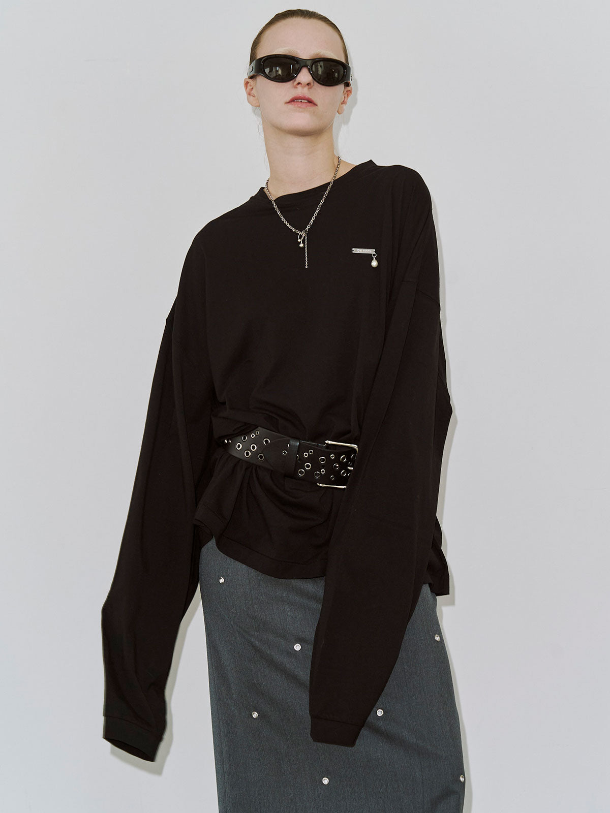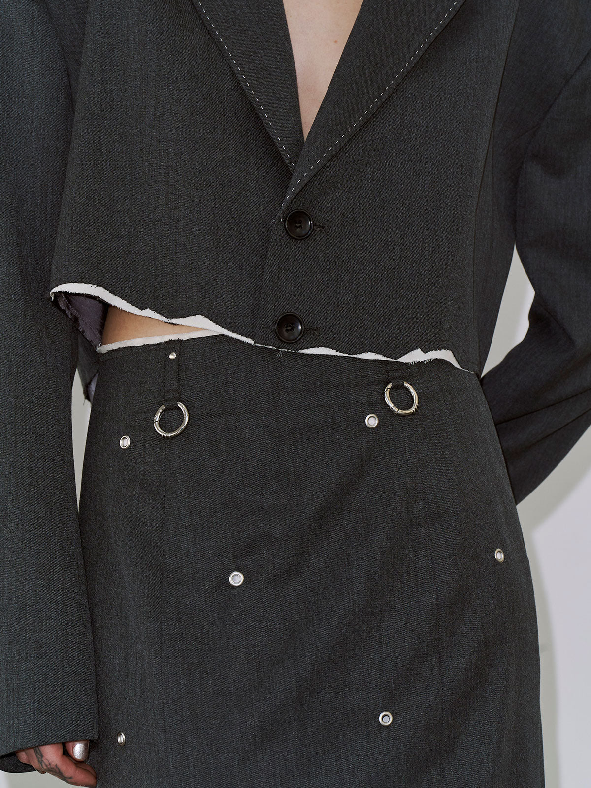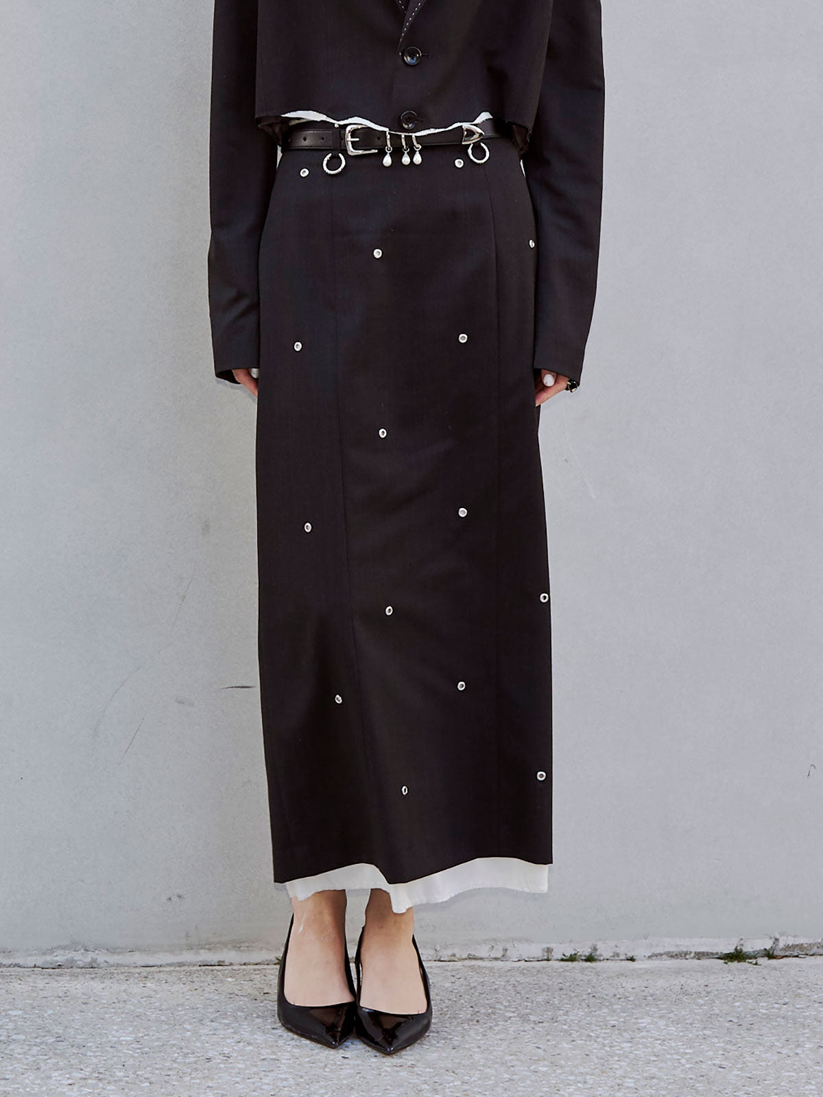 全体にハトメを打ち込み、ミニマルなシルエットにエッジをプラス。